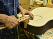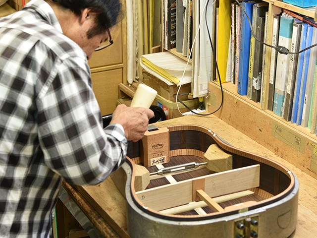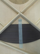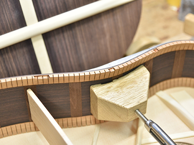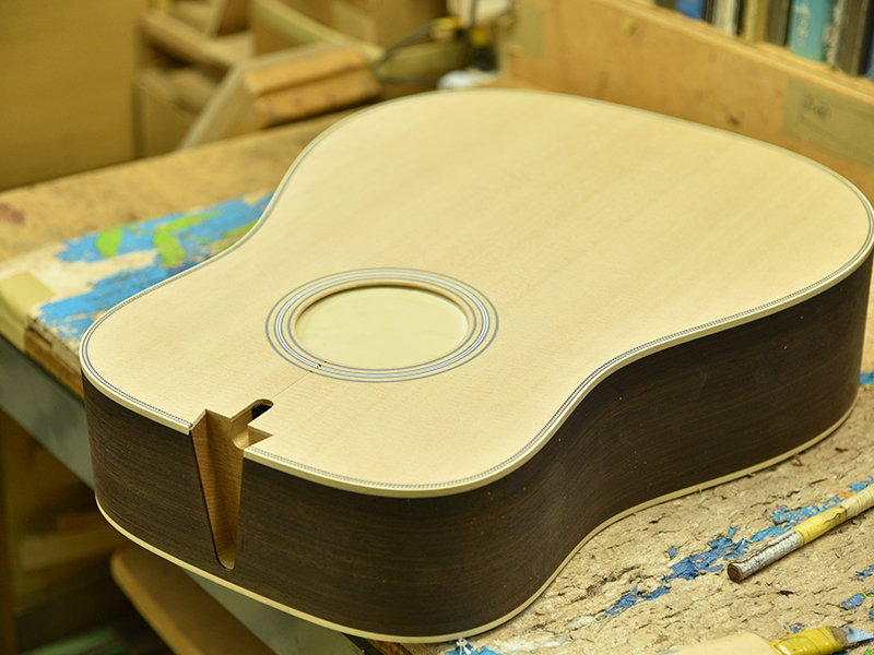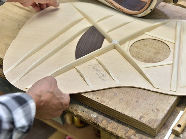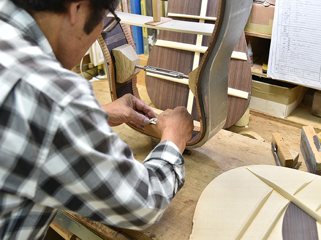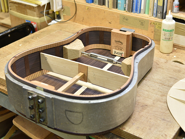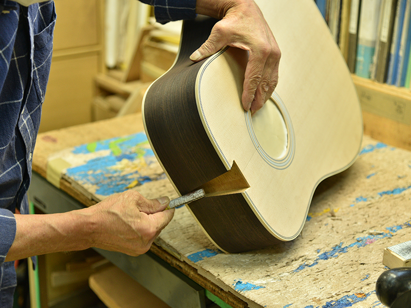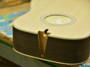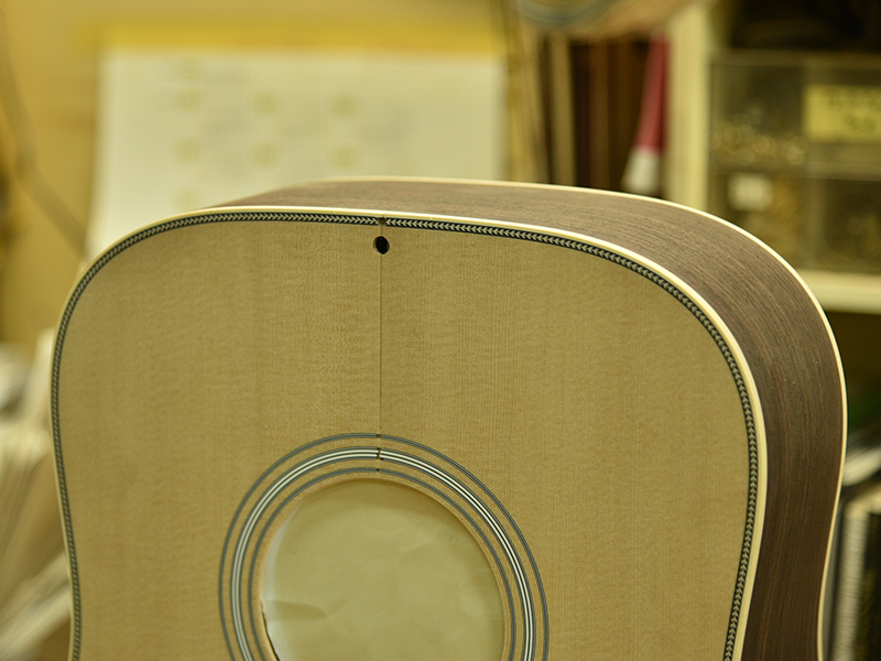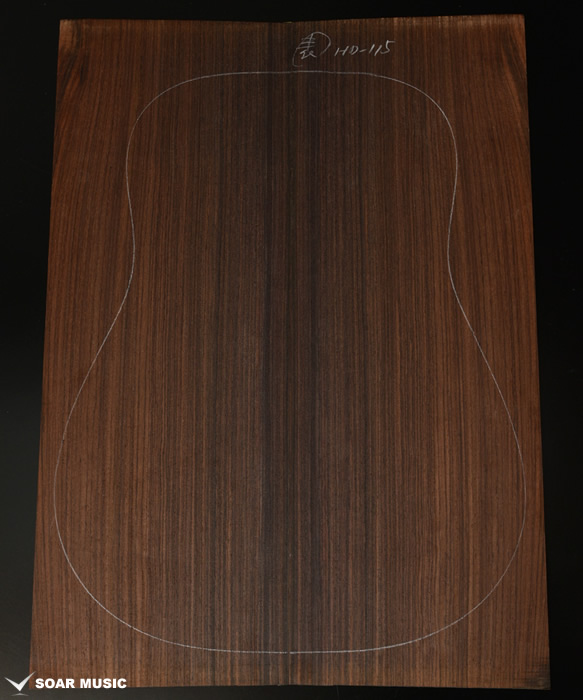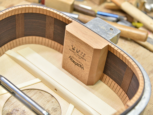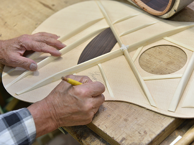 ブレイス構造をセミ・フォワードXとし、採用される駒下補強材について、従来の115で採用される面積よりもサイズが小さいローズウッドプレートを張ります。これにより、さらに豊かな音色と音量の獲得を狙います。