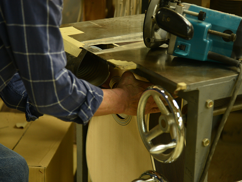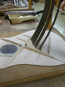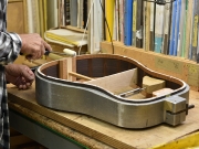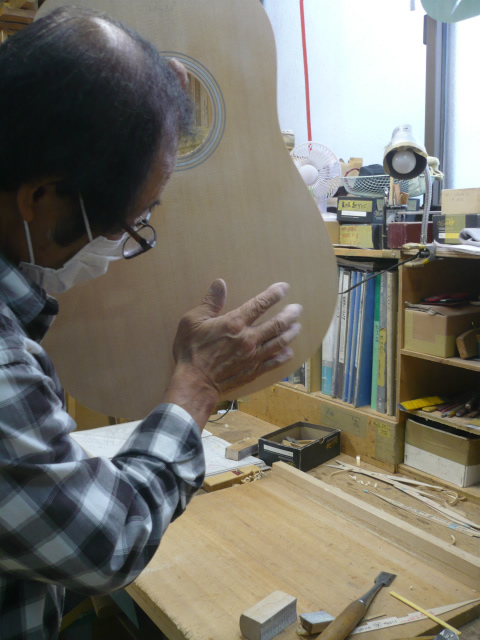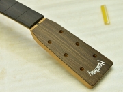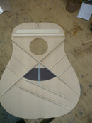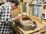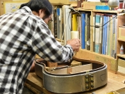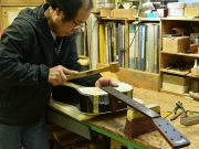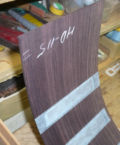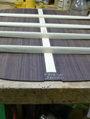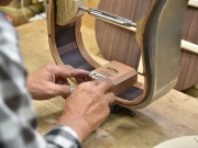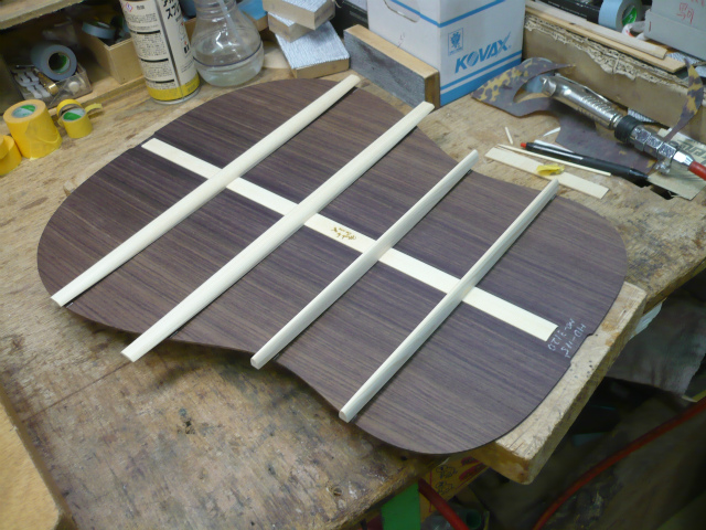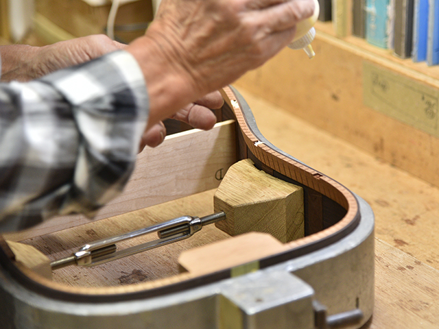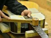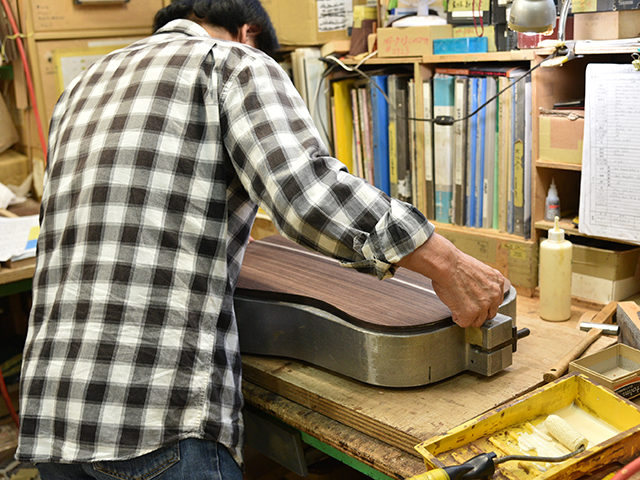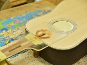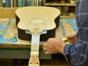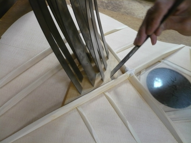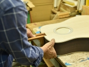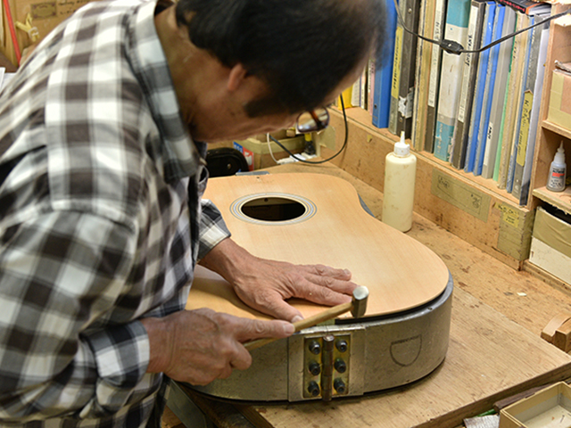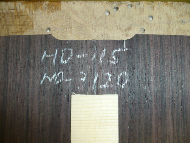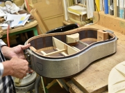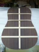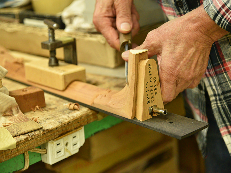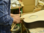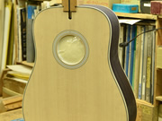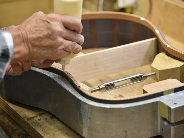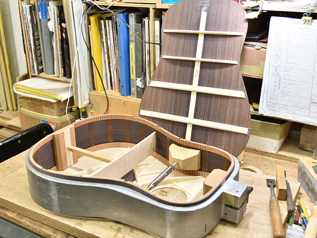 ブレイス構造をセミ・フォワードXとし、採用される駒下補強材について、従来の115で採用される面積よりもサイズが小さいローズウッドプレートを張ります。これにより、さらに豊かな音色と音量の獲得を狙います。