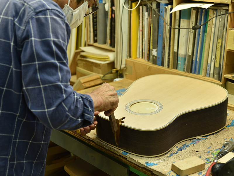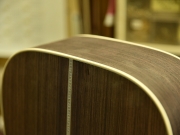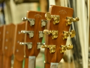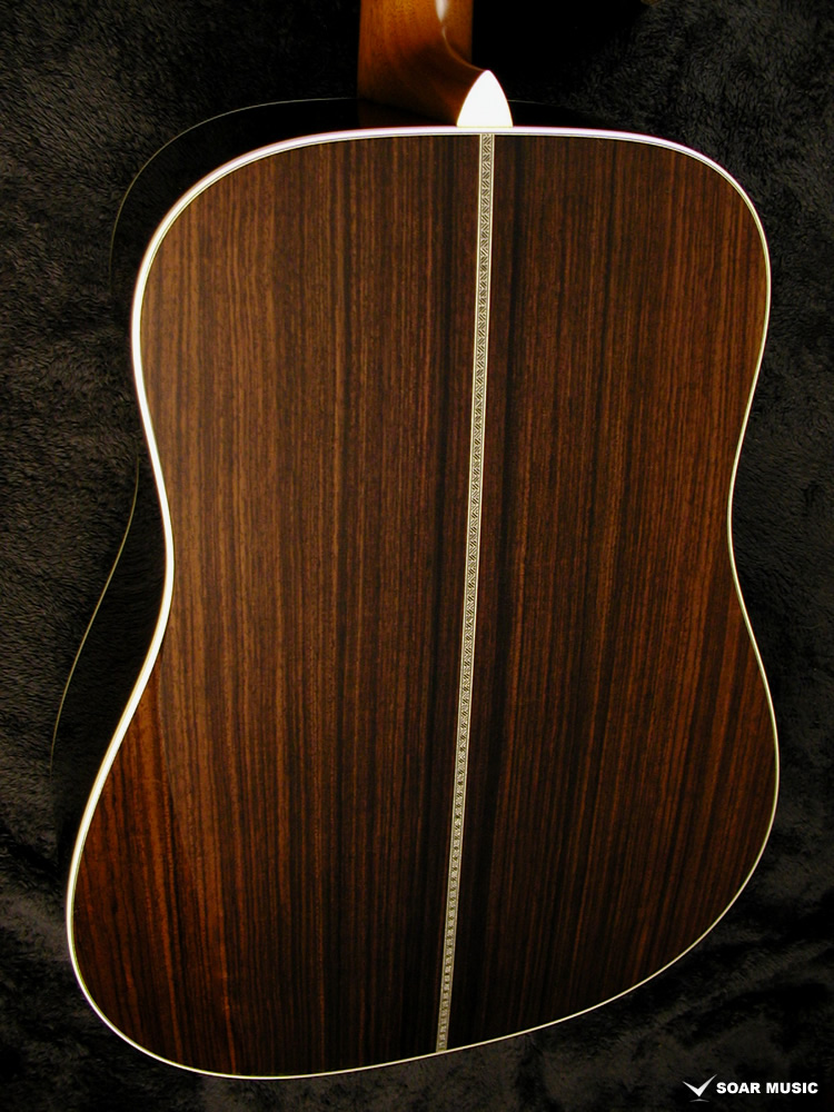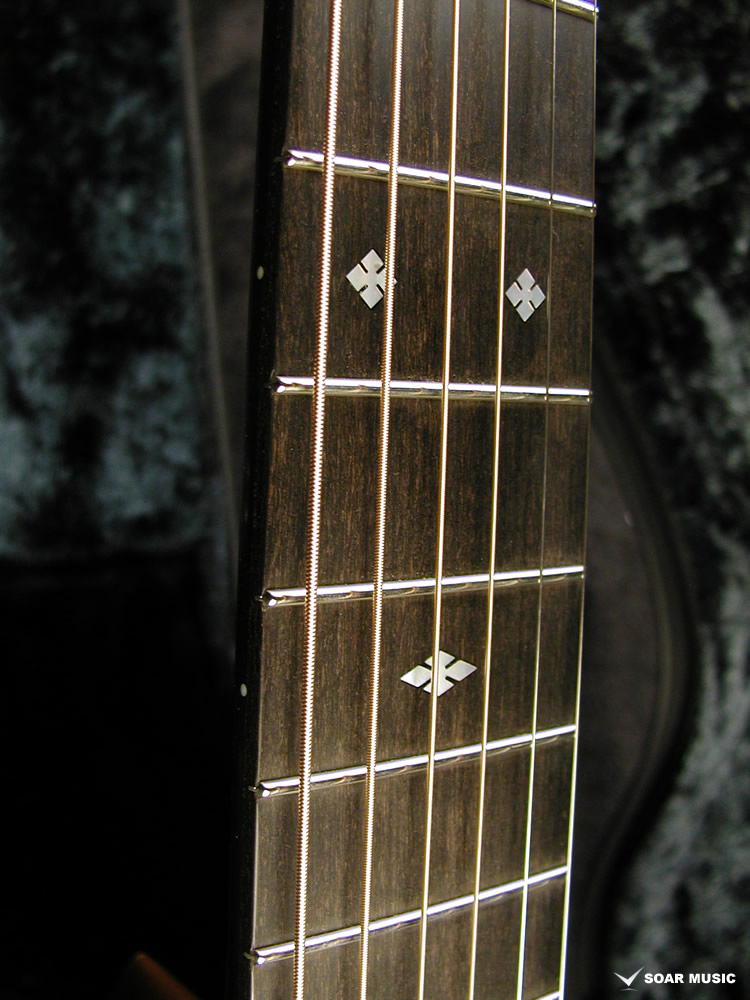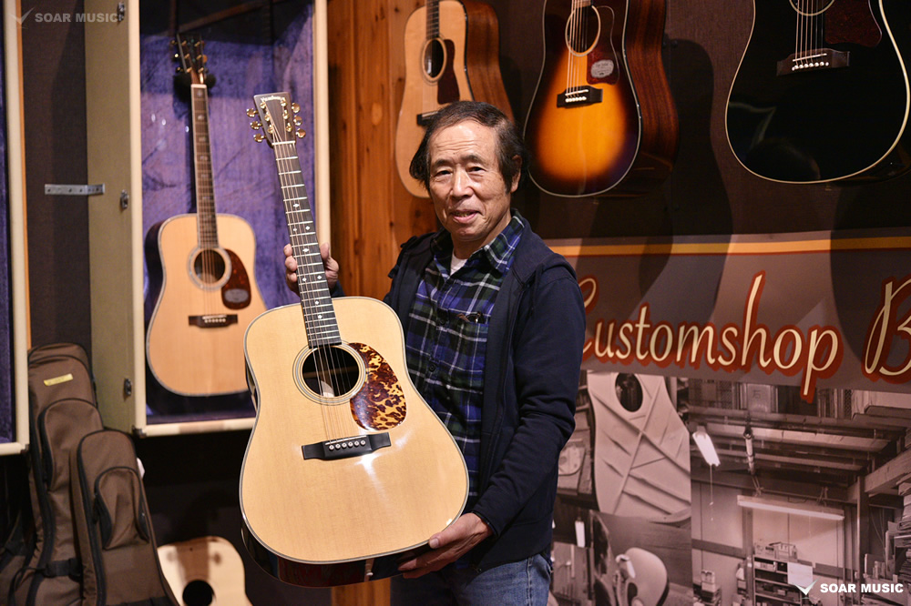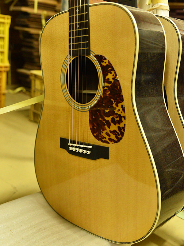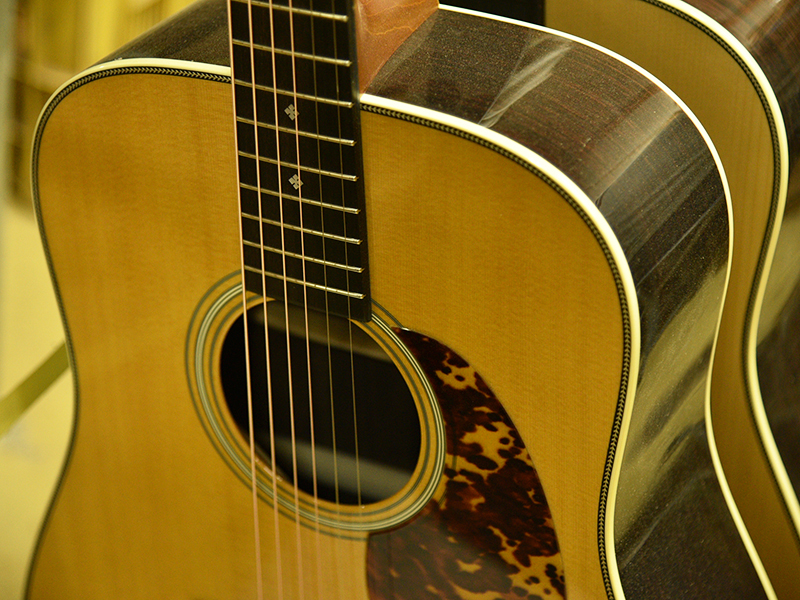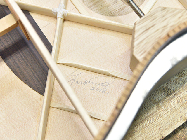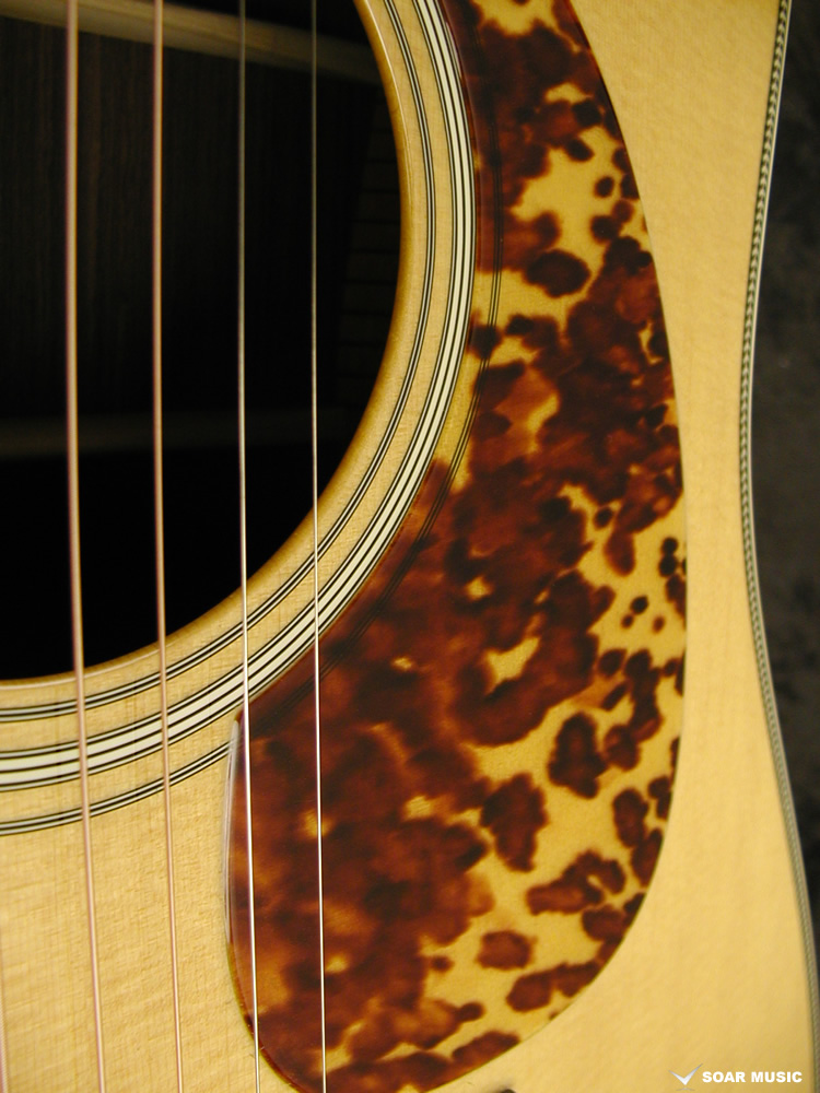 採用されたボディ材の種類はオリジナルに基づき、sitka spruce と indian roserwood という一見シンプルな仕様です。 ただし、百瀬氏自らが長年ストックして来た極上の材の中から、さらに氏ご本人にセレクトしていただいたマスターグレードの材を使用します。 ネックは Honduras mahogany 1P を採用。ピックガードには厳選した本鼈甲を使用します。また、例えば指板のインレイも昭和時代に使われていた、現代に比べて大きめのものを使用するなど細部に至るまで当時の雰囲気を再現しており、特別なモデルに相応しい素材と、こだわりのコンセプトで形造られます。