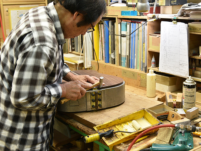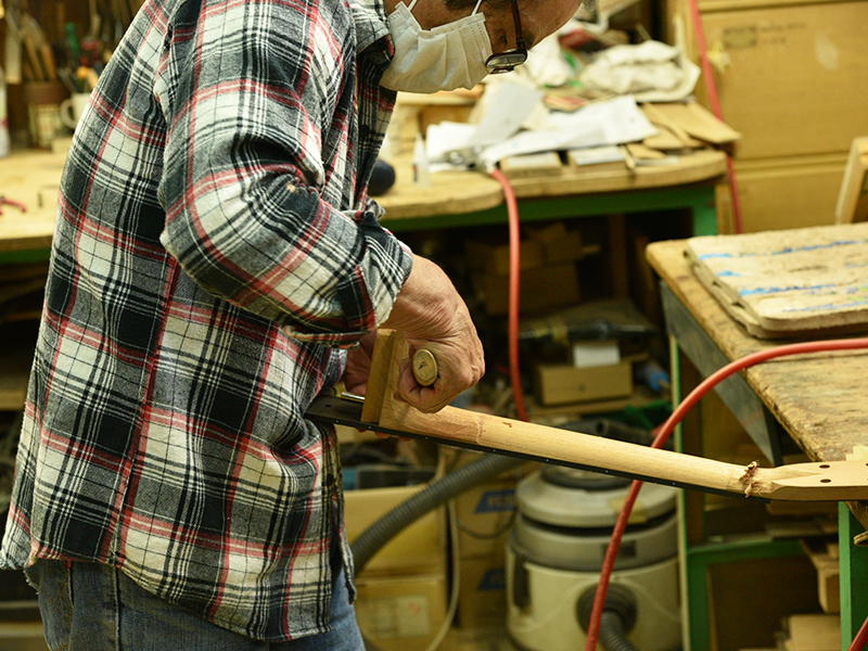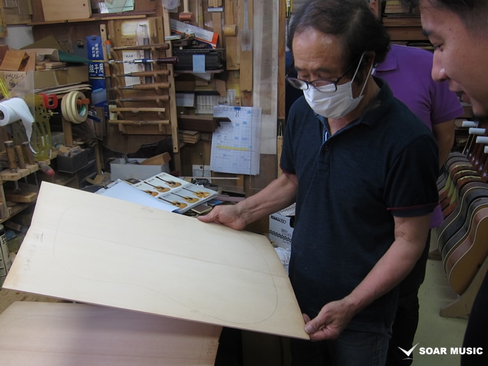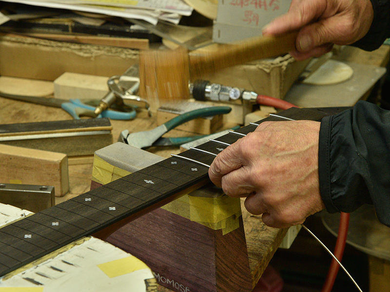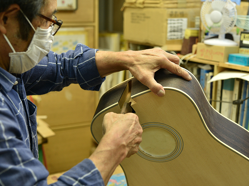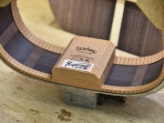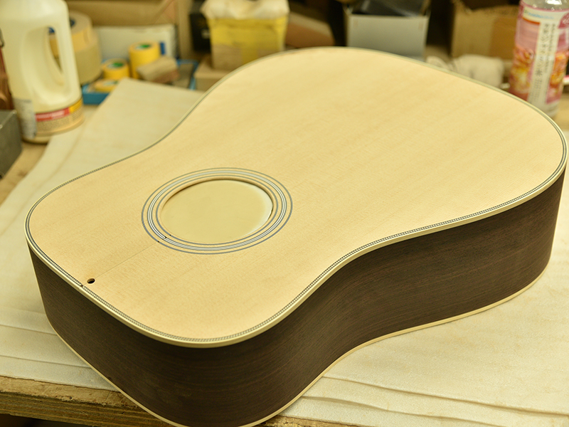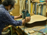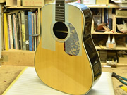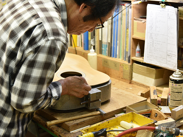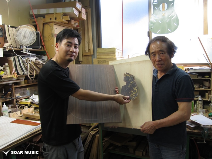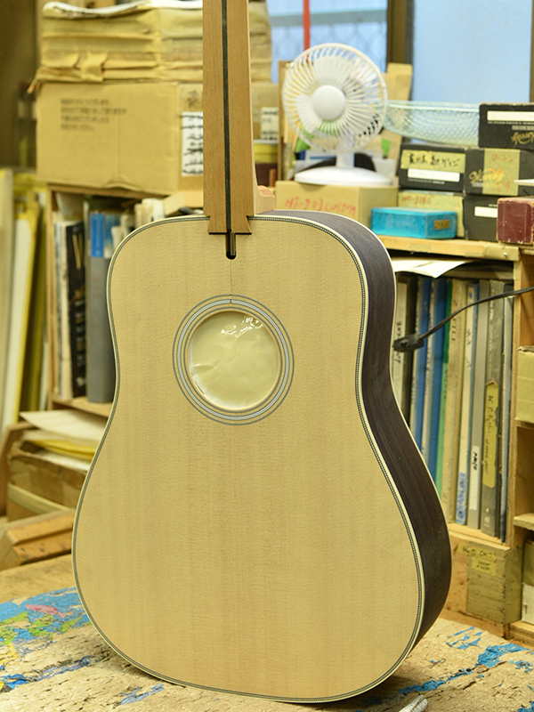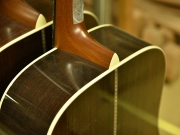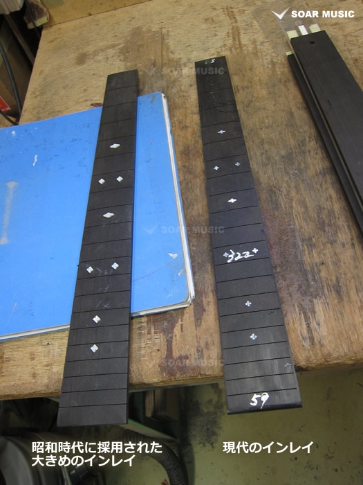 採用されたボディ材の種類はオリジナルに基づき、sitka spruce と indian roserwood という一見シンプルな仕様です。 ただし、百瀬氏自らが長年ストックして来た極上の材の中から、さらに氏ご本人にセレクトしていただいたマスターグレードの材を使用します。 ネックは Honduras mahogany 1P を採用。ピックガードには厳選した本鼈甲を使用します。また、例えば指板のインレイも昭和時代に使われていた、現代に比べて大きめのものを使用するなど細部に至るまで当時の雰囲気を再現しており、特別なモデルに相応しい素材と、こだわりのコンセプトで形造られます。