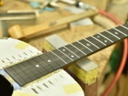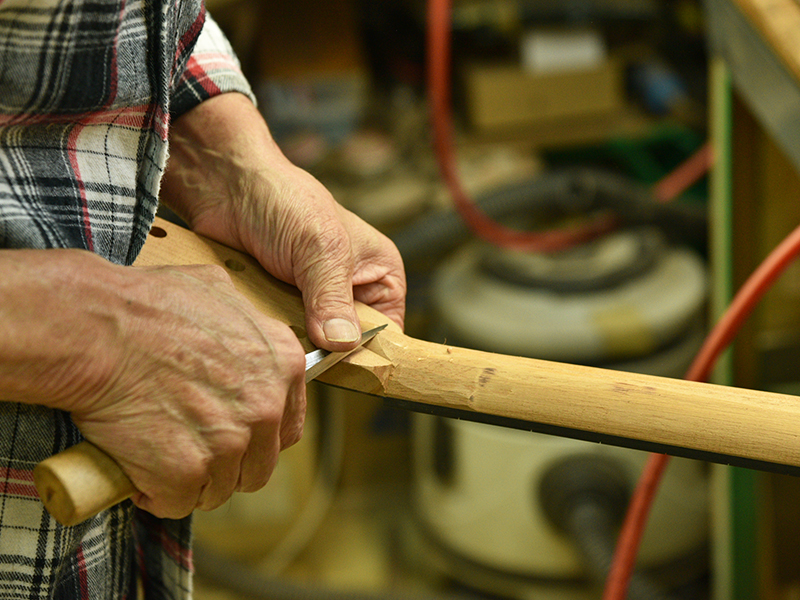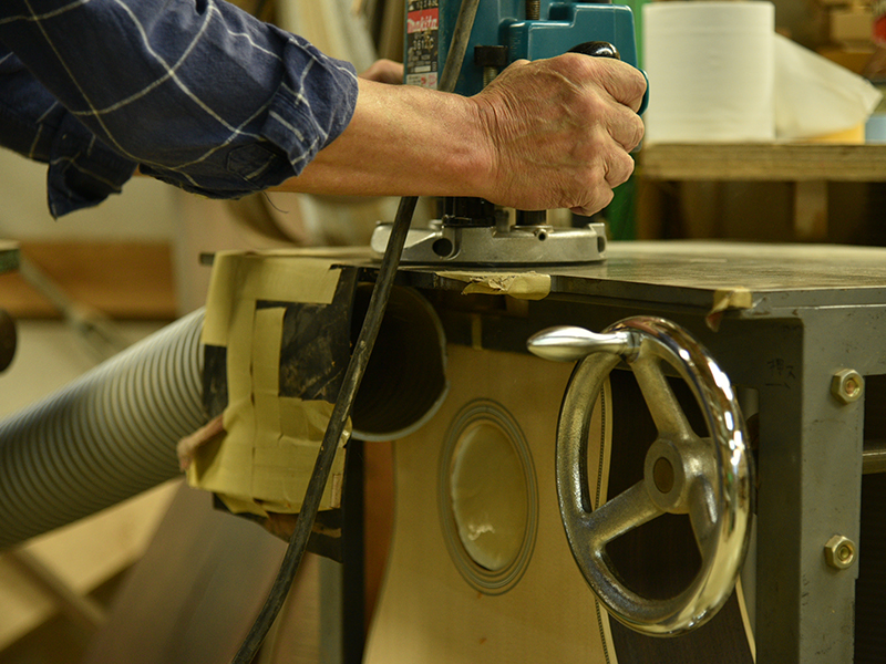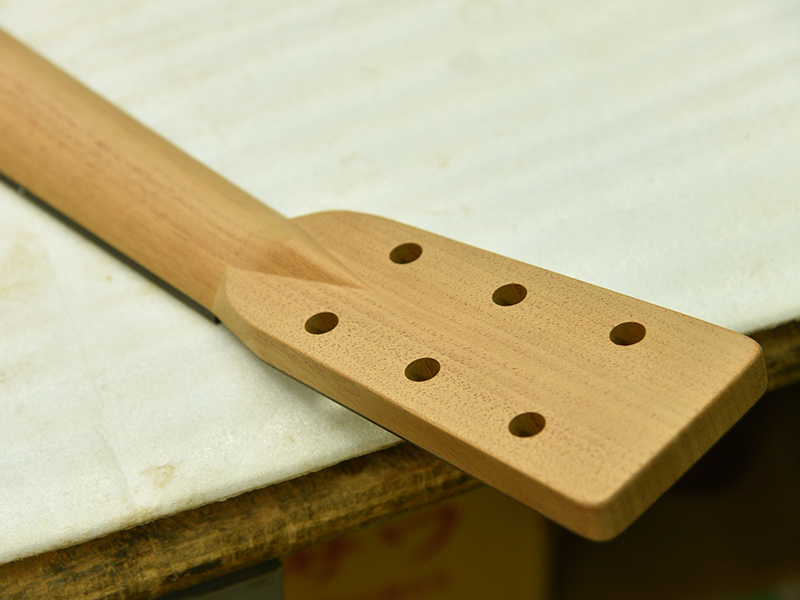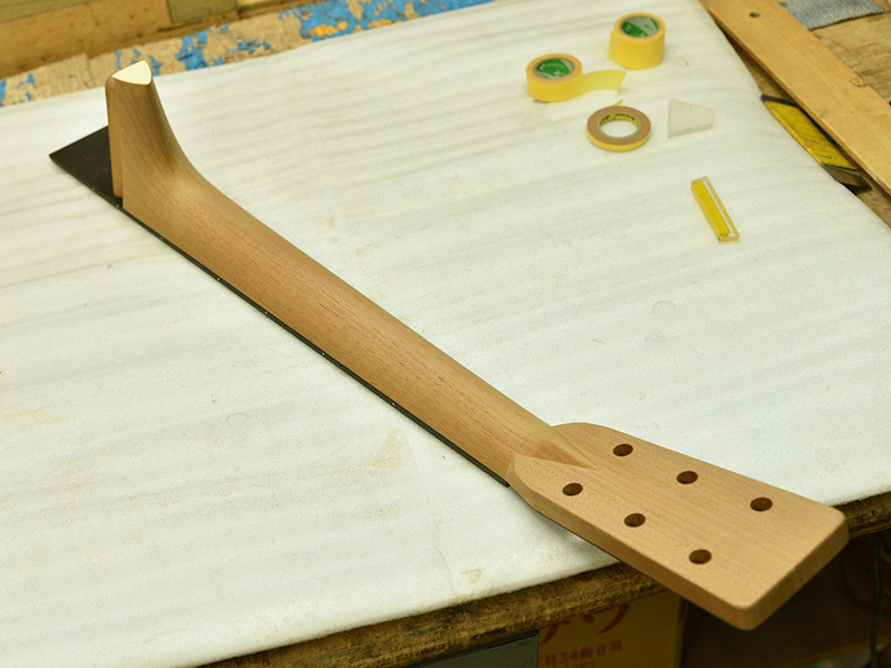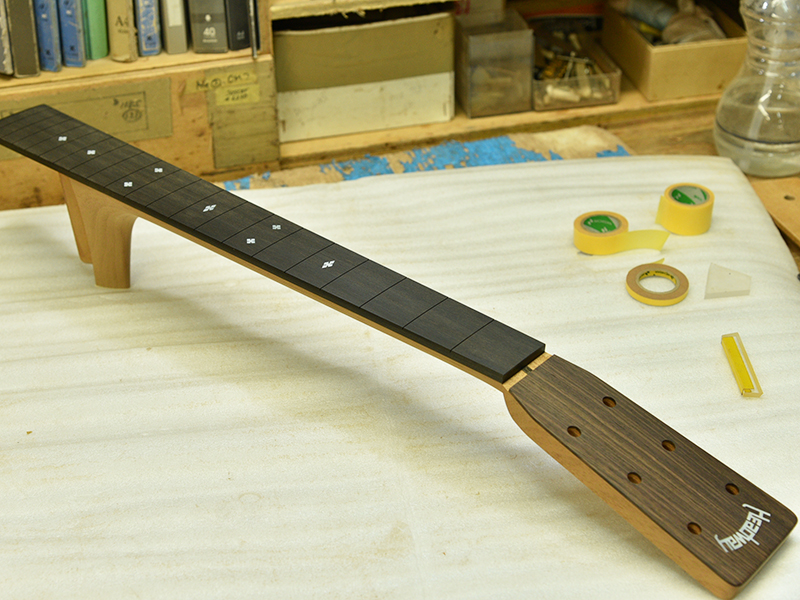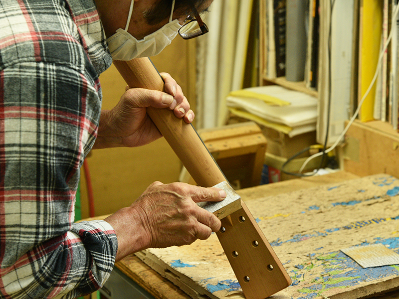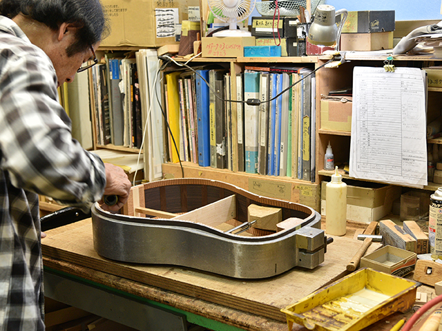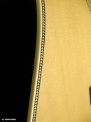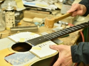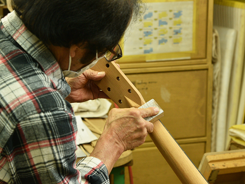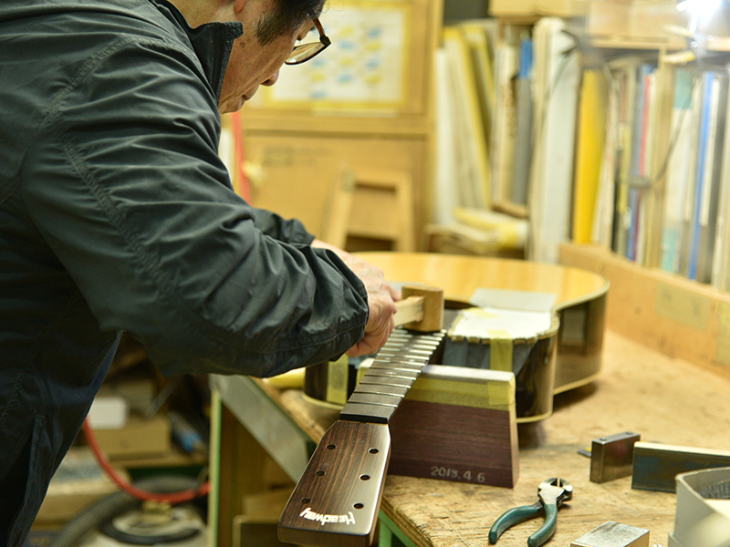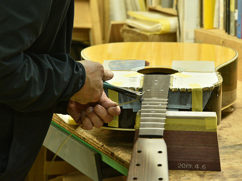 採用されたボディ材の種類はオリジナルに基づき、sitka spruce と indian roserwood という一見シンプルな仕様です。 ただし、百瀬氏自らが長年ストックして来た極上の材の中から、さらに氏ご本人にセレクトしていただいたマスターグレードの材を使用します。 ネックは Honduras mahogany 1P を採用。ピックガードには厳選した本鼈甲を使用します。また、例えば指板のインレイも昭和時代に使われていた、現代に比べて大きめのものを使用するなど細部に至るまで当時の雰囲気を再現しており、特別なモデルに相応しい素材と、こだわりのコンセプトで形造られます。