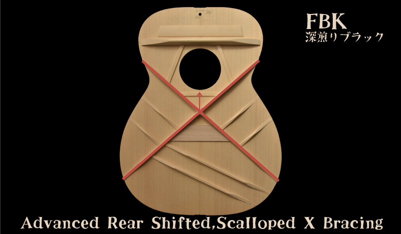 ARSブレイシングは、通常のXブレイシングの交差位置をよりブリッジ側へずらした仕様。これによりトップ面に対する強度も増し、永くご愛用いただけるモデルに仕上がります。