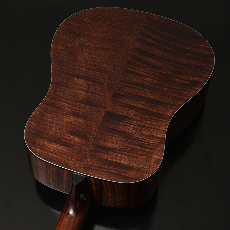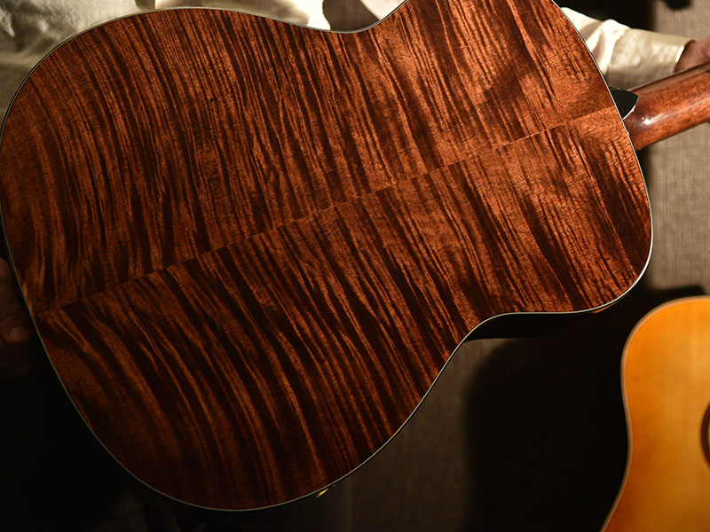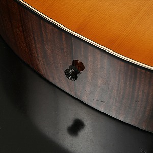 ボディのサイド・バックの材料には杢目の美しいフレイムマホガニーを採用しております。 これにより高級感のあるルックスに仕上がると同時にマホガニー特有の柔らかく中低音からバランス良く鳴るモデルに仕上がっております。