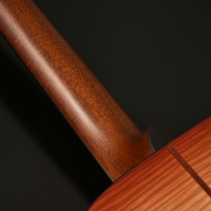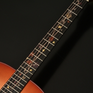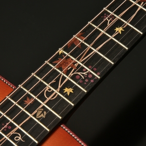 指板には秋の小道をイメージしたような、野ブドウのツタと舞い散る紅葉で秋の装いを伝統的なツリーオブライフの様に指板全体に施しております。 インレイの素材には5種類の木材(サティーネ・モビンギ・パープルハート・ホオノキ・カエデ)を用いて物静かな秋の雰囲気を表現しており、ウッディで派手にはなりすぎない絶妙なバランスに仕上げております。