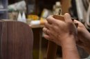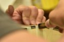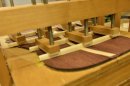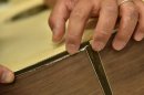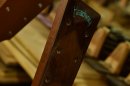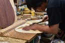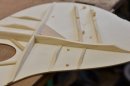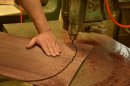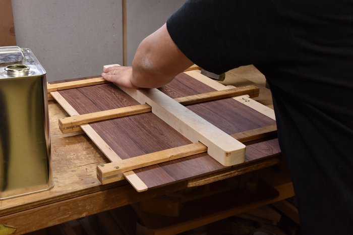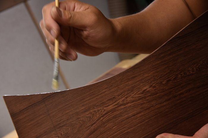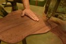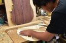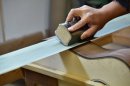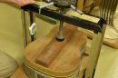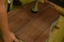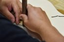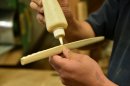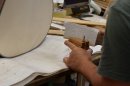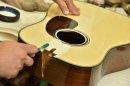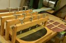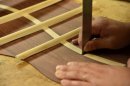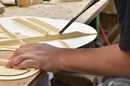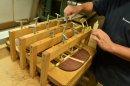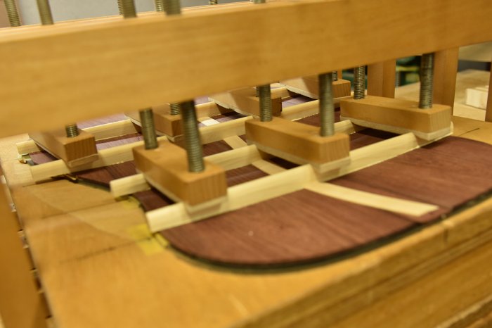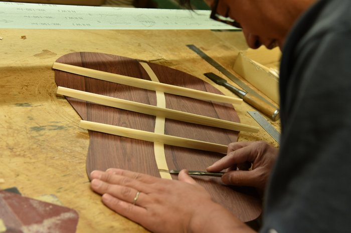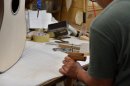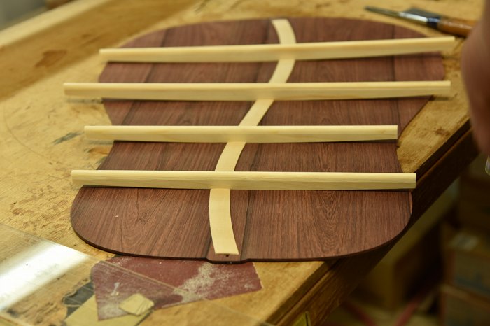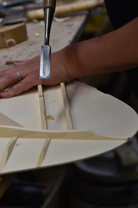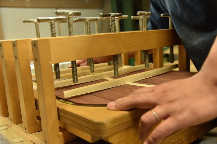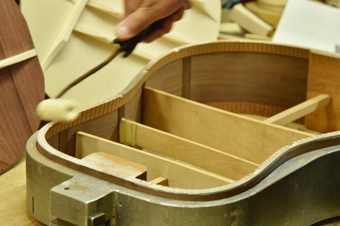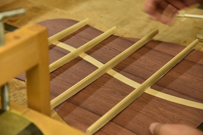 裏甲の力木接着風景です。力木をタイトボンドで塗布し、専用の工具を使い接着します。