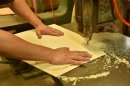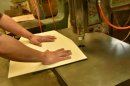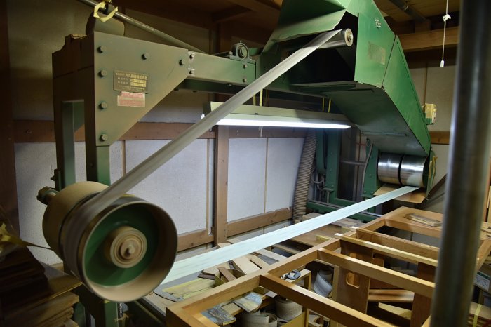 ベルトサンダーでの研磨作業です。バインディングを巻いた後サンダーにかけて平面を出します。