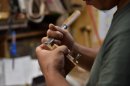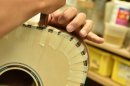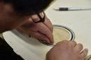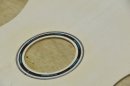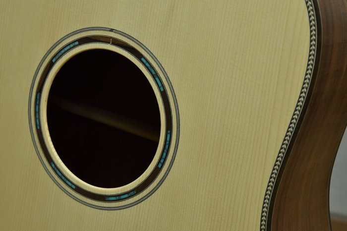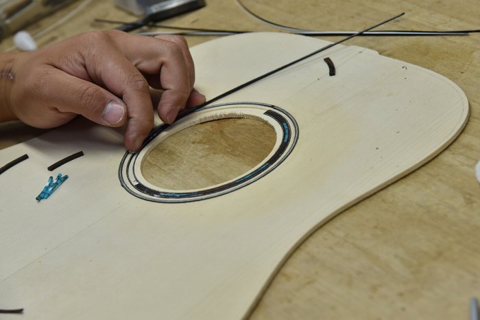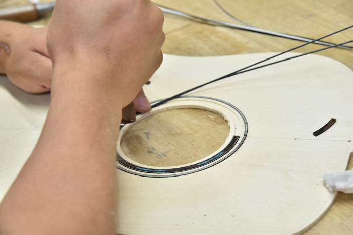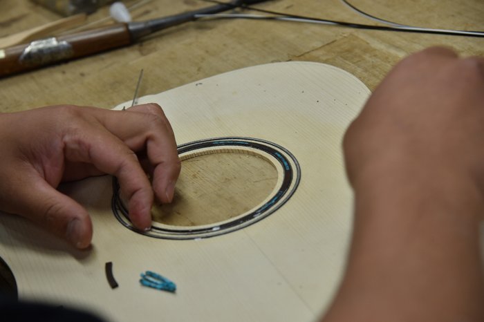 ロゼッタの制作になります。溝を掘った後にローズウッドとターコイズ、パーフリングを重ねあわせ一つ一つ埋めていきます。