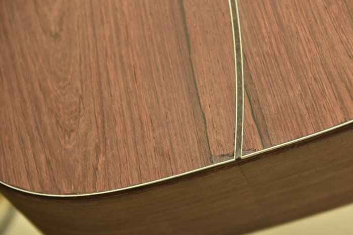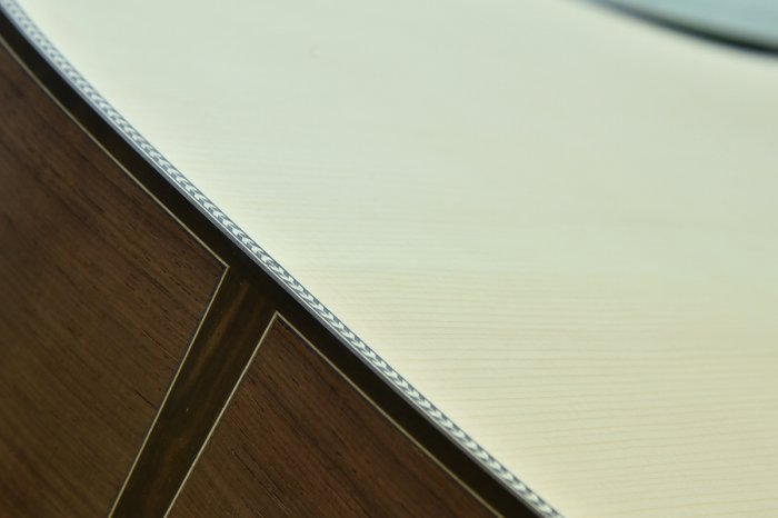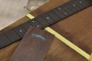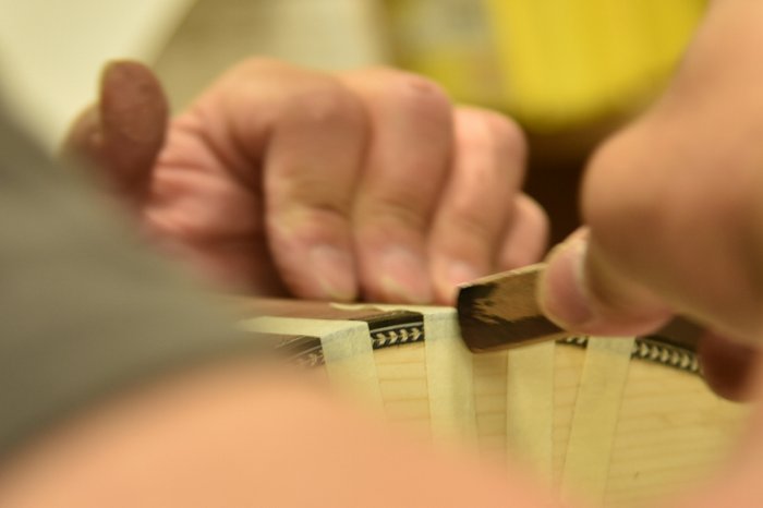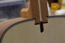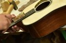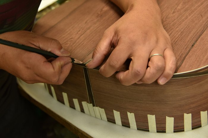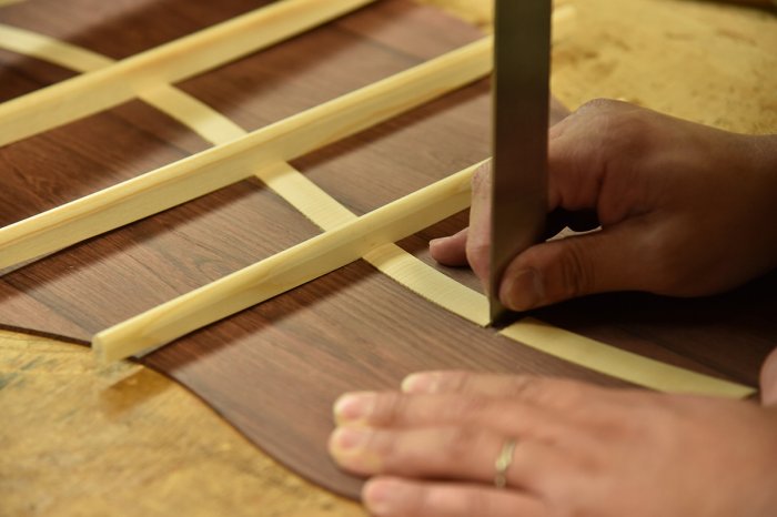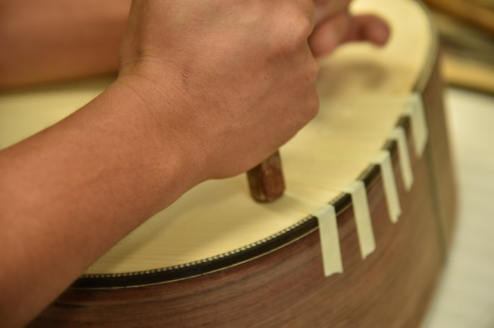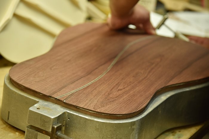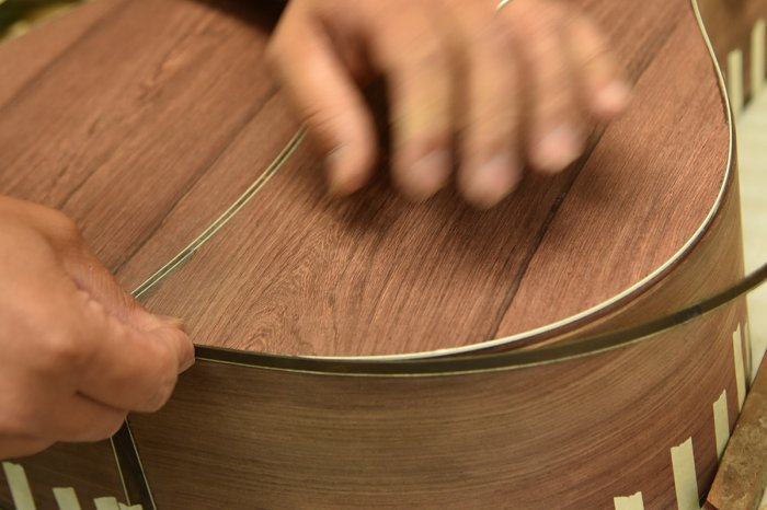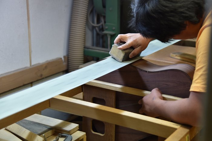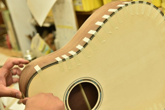表甲と裏甲にバインディングを接着する作業の画像になります。タイトボンドを使用し、隙間にならないように棒で押しながら接着していきます。また当特注モデルはバインディングに細かなラインも入るため、ずれないように細心の注意を払います。