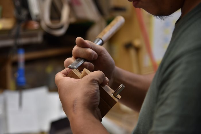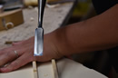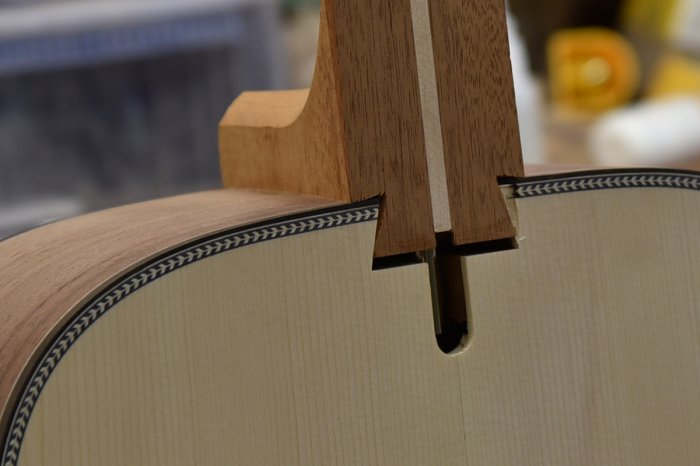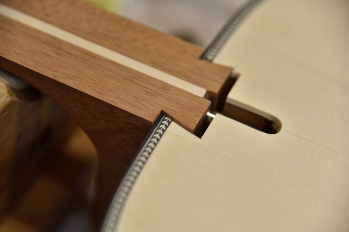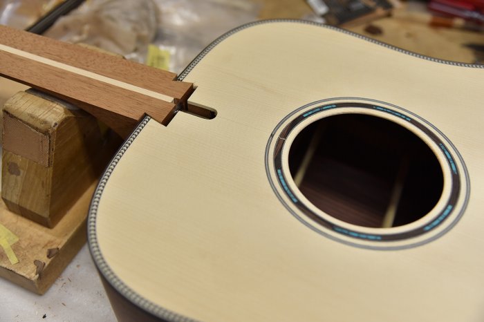 ネックの仮仕込みの作業になります。アリ溝加工をしたボディに対し、ネックの角度や溝の微調整を繰り返します。