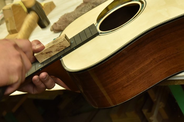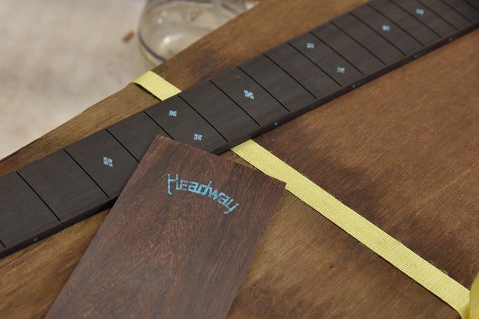 ボディの塗装が終わり、ネックの後仕込み作業に入ります。最終工程を経ていよいよ完成となります。
