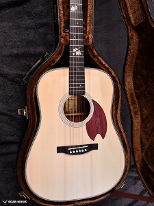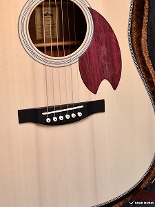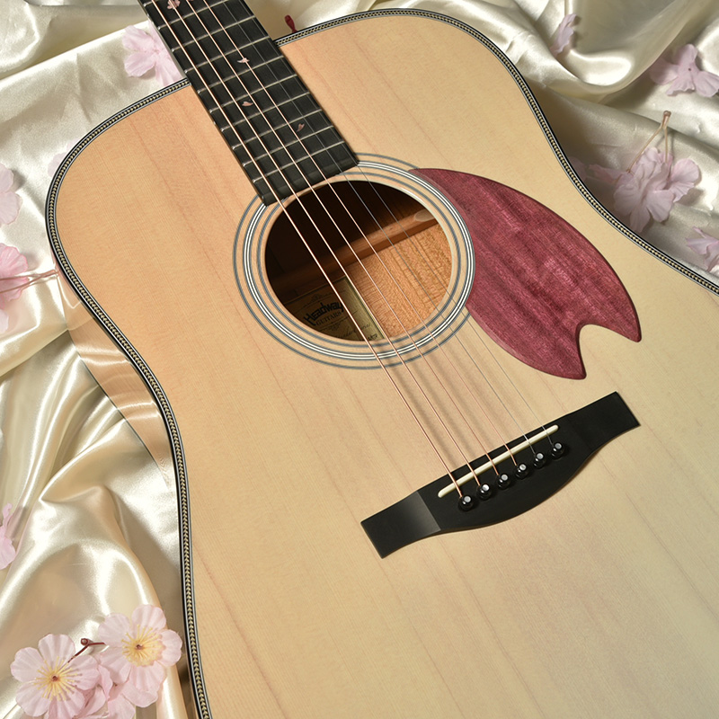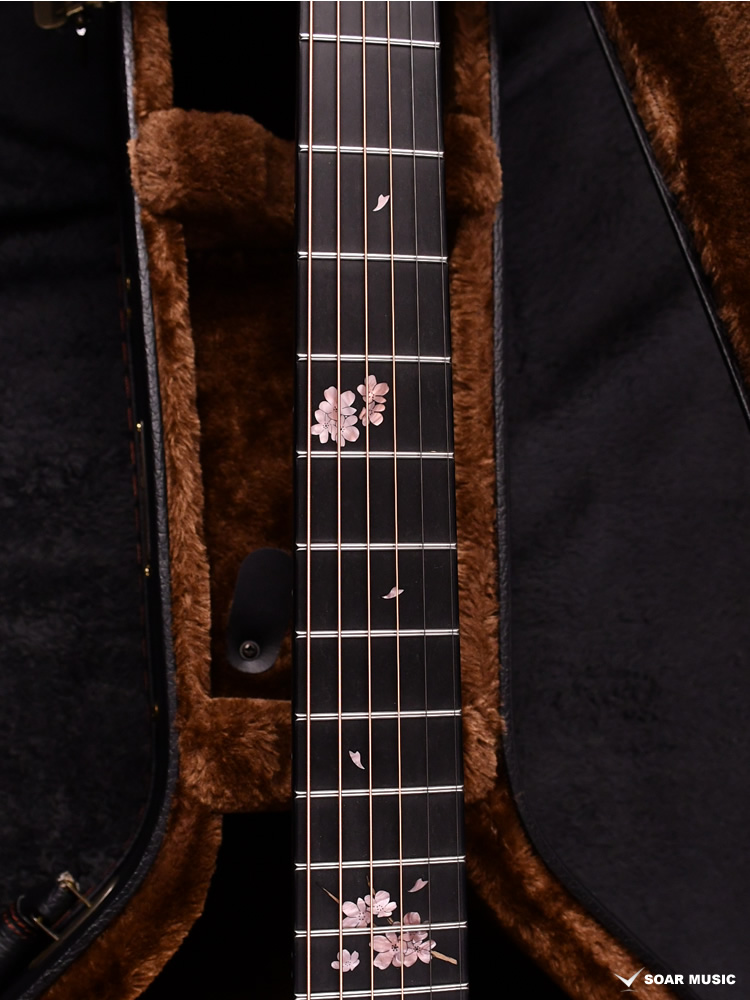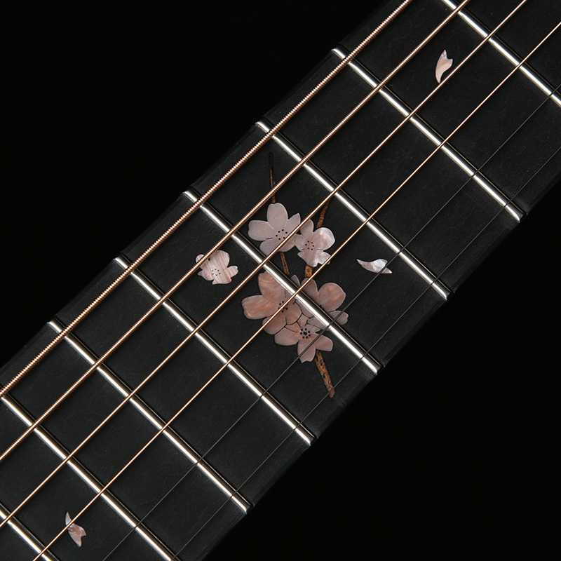 桜モデルを象徴する要素の一つとして、指板上にはアクリルと木材を使用して巧みに表現された桜のインレイが施されています。また、ピックガードには材の色が紫色であることが特徴のパープルハートが用いられました。