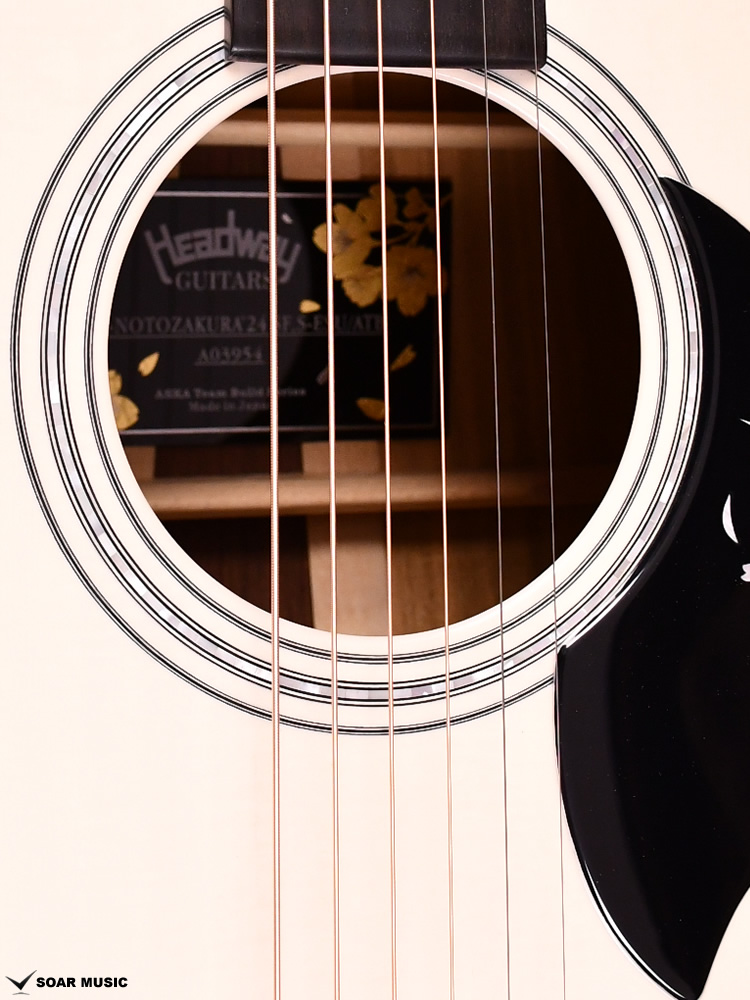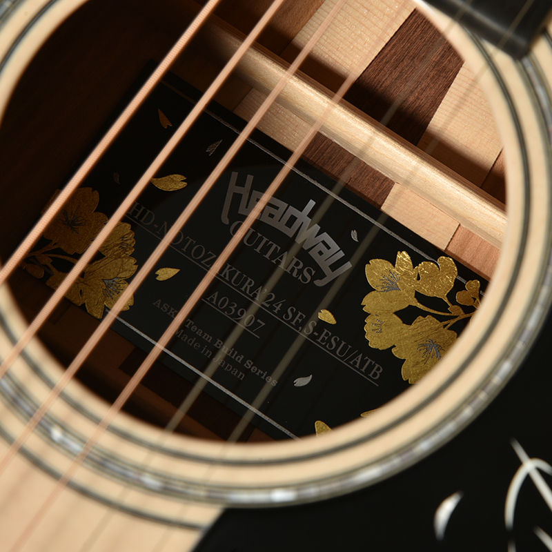 ボディトップにはHeadway Aska Team Build Seriesの職人が選んだ良質な「シトカ・スプルース」をセレクト。 本機最大の特徴である桜材を引き立てる為、ボディバックのセンターには希少な「マダガスカル・ローズウッド」をセレクトし、トップ材と合わせて本桜材の『桜らしい』甘さとも表現できる中音域と小気味よい高音の抜けをしっかりと強調したサウンドを作り出しています。