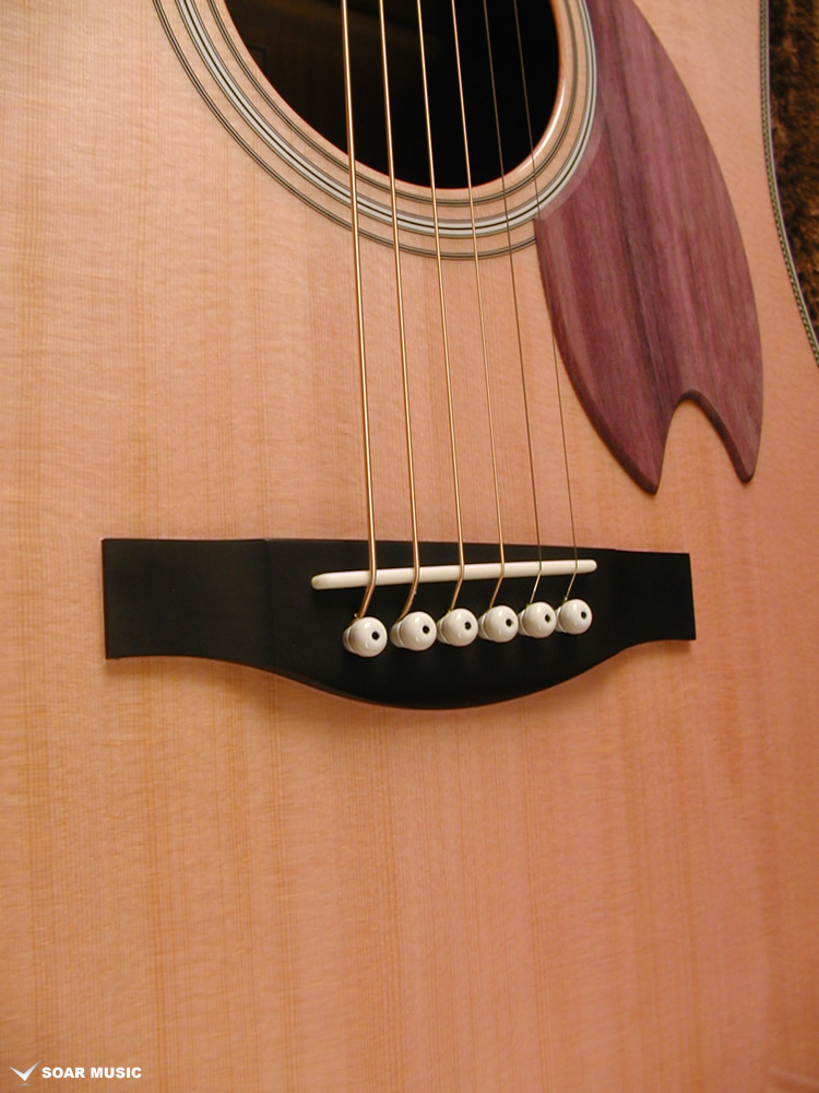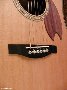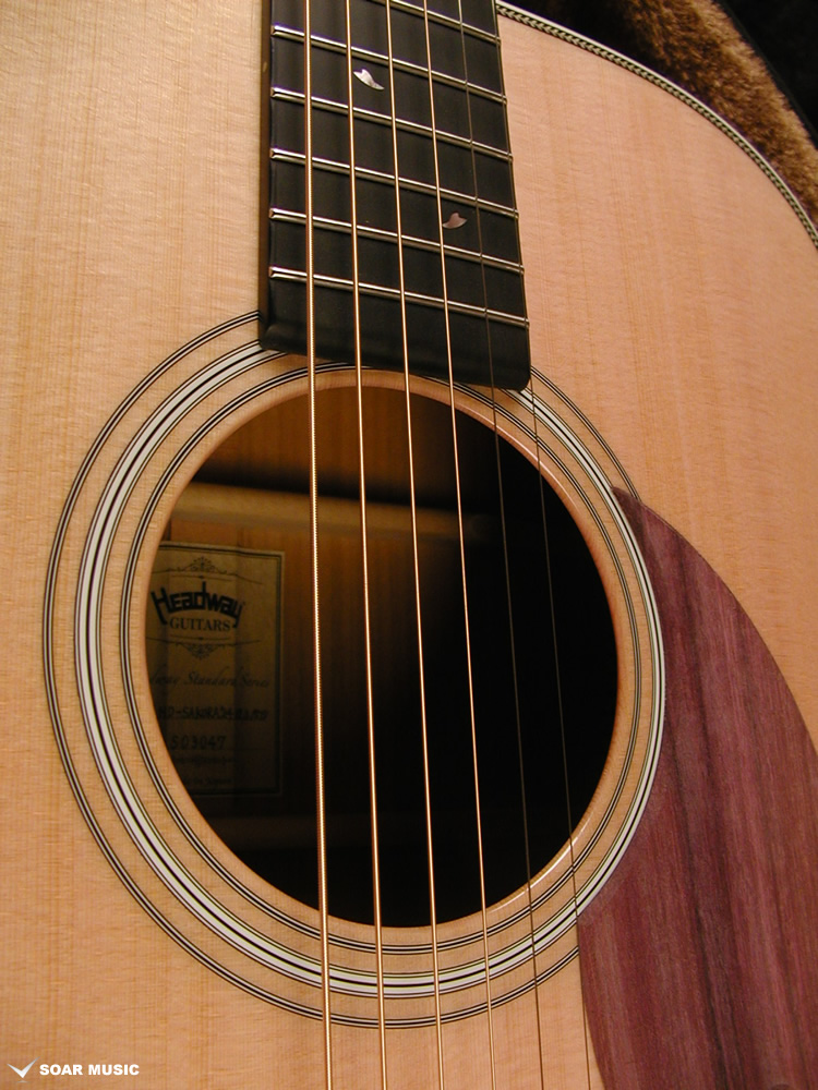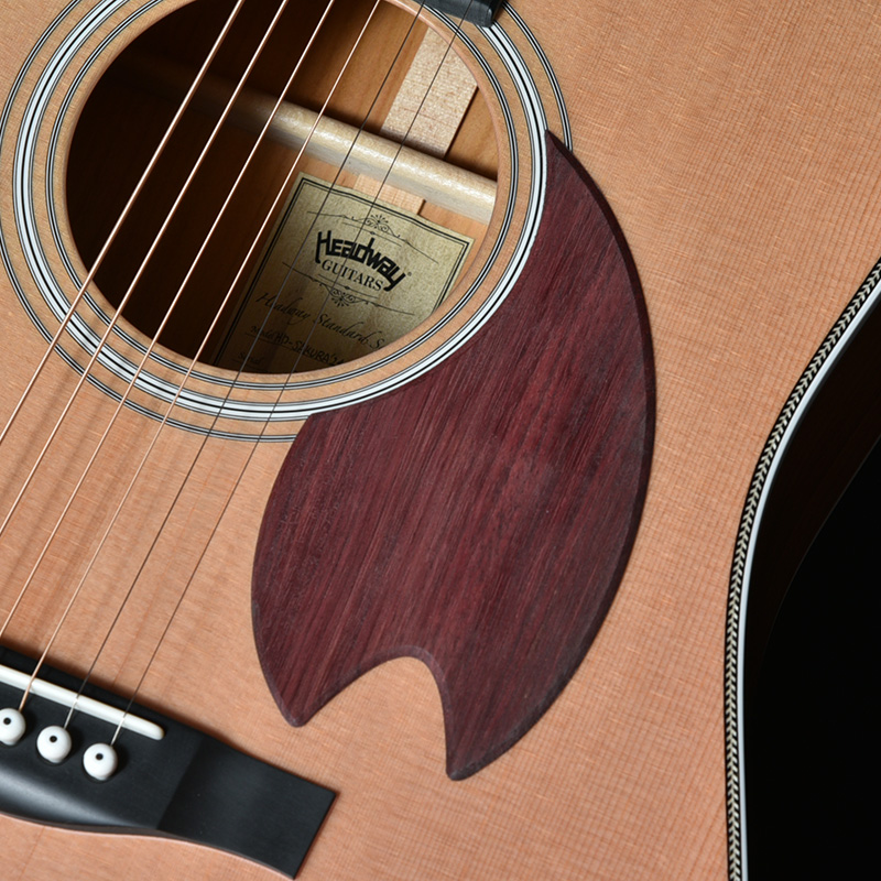 Headwayマスタービルダーの百瀬恭夫が1934年製のビンテージギターのブレーシングを研究し、独自に発展させたブレーシングを継承。Xのクロス位置がサウンドホールに近いセミフォワードシフトで新品時より低音の反応がよく、ボリュームのある鳴りを持ちます。フォワードシフトよりも5mmほどブリッジ寄りなっていることにより、トップ板の安定性も考慮された設計が行われています。