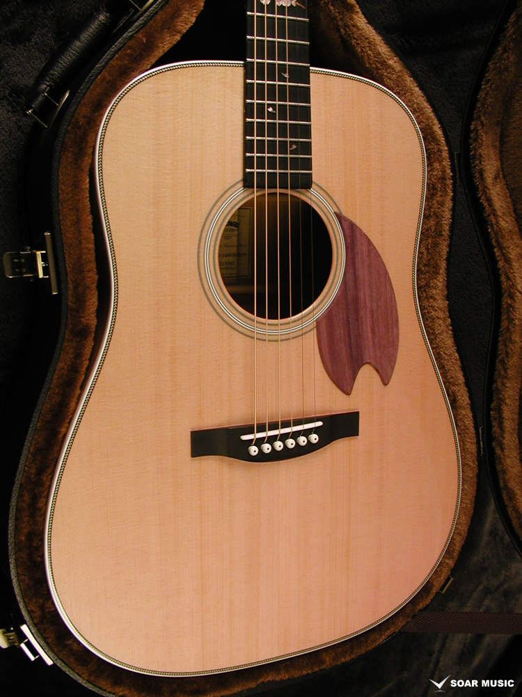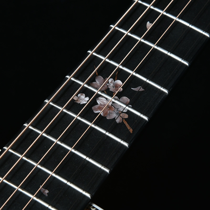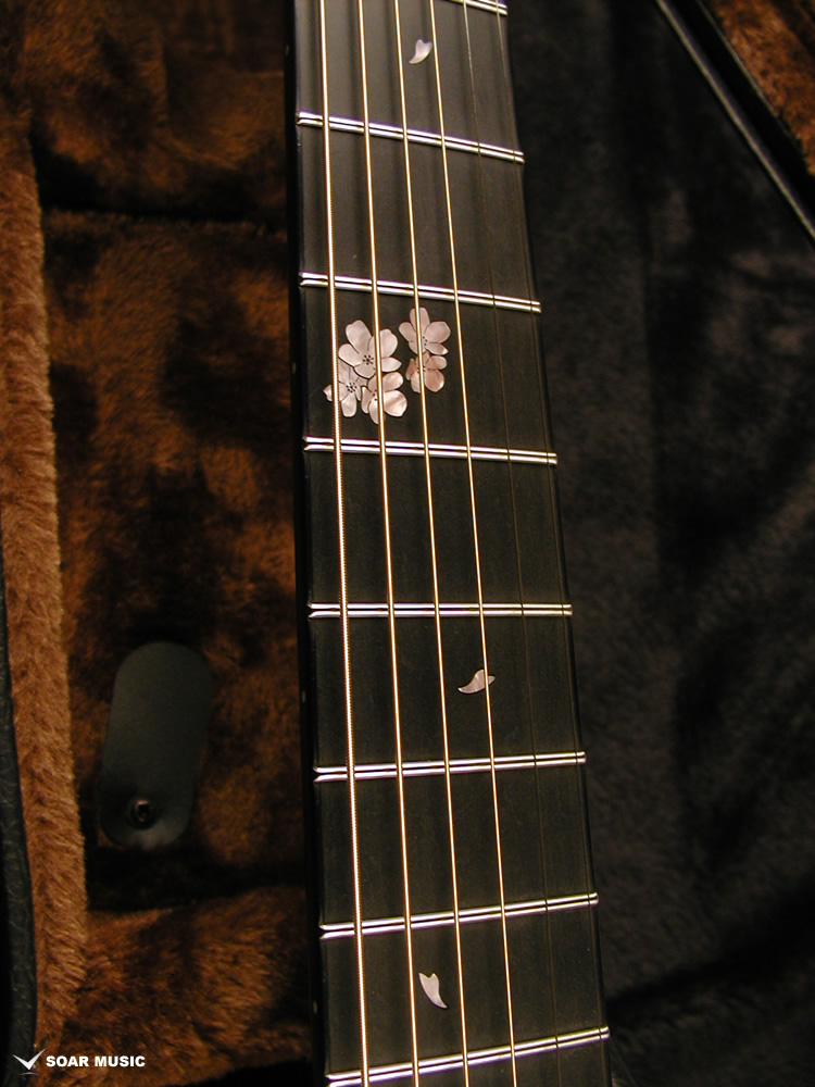 桜モデルを象徴する要素の一つとして、指板上にはアクリルと木材を使用して巧みに表現された桜のインレイが施されています。また、ピックガードには紫色の木色を持つパープルハートが用いられました。