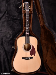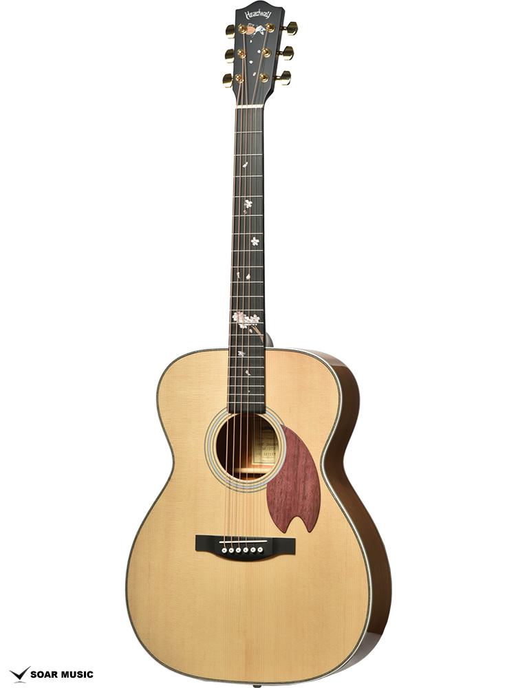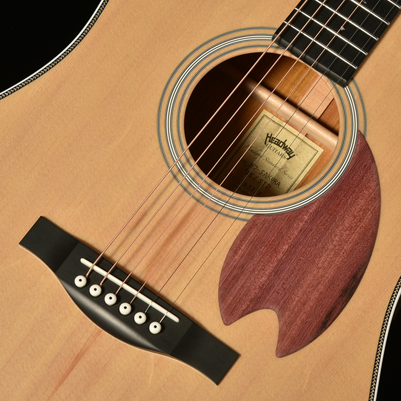 桜ギターを象徴するパープルハート材で作られた桜型のピックガード。最初に作られた一本から変わらない、Headwayの桜ギターである証です。