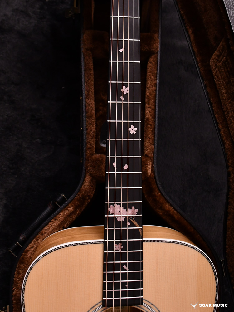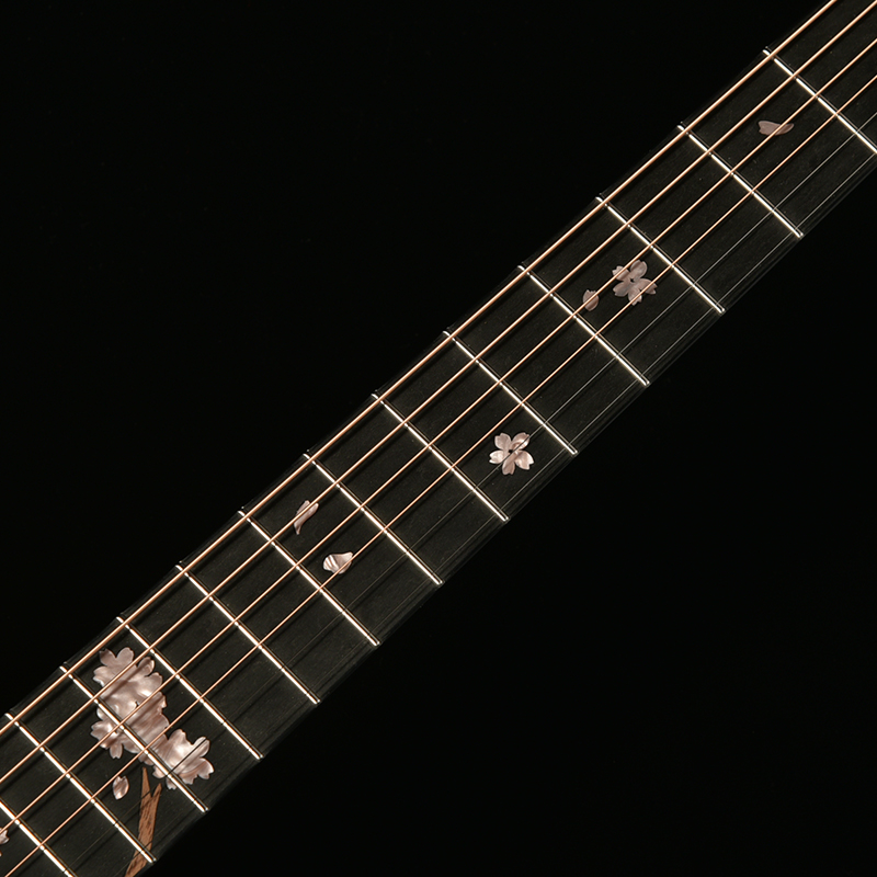 桜の花びらを模ったインレイが指板を美しく彩ります。通常のポジションマークをもつギターから持ち替えても違和感の少ないよう、演奏性にも配慮されたデザインです。