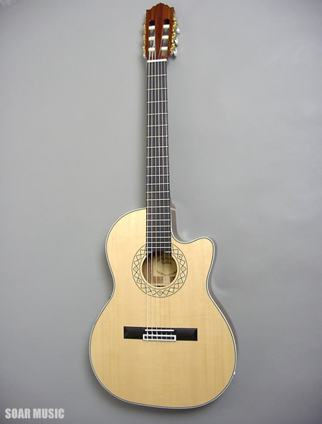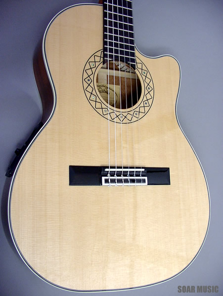 サウンドホール周りのデザインも美しく、薄いボディは女性でも使い易くなっております。