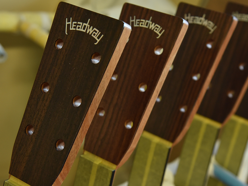 アドバンスドリアシフトはノーマルの位置から若干ブリッジ側に寄せたレイアウト。フォワードシフト、ノーマルの音の傾向を踏まえると、強度が上がり振動しづらくなることで、当初は「硬く扱いづらい音になるのではないか」という見方もありましたが、数本制作する中で得られた結果は音の芯、特に近年のヘッドウェイで少し弱かったプレーン弦(1,2弦)の鳴りに存在感が増した、という予想外の結果でした。 1音1音しっかりと鳴り響き、芯のある迫力のサウンドを実現。また、位置をブリッジ側へ寄せることでトップ材に対しての丈夫さも増し、永くご使用頂ける安心のモデルに仕上がりました。ARS解説ページはこちら ネックの補強にアルミチャンネルトラスロッドを採用しネック自体の強度が向上しています。 ※製作中の画像はHDシェイプとなります。 ヘッドウェイ・スタンダードシリーズについて Headway(ヘッドウェイ)のStandard Series(スタンダード・シリーズ)はヘッドウェイが育んできた基本設計、高い組み込み精度はそのままに、製作工程や装飾部分を見直し、よりシンプルに基本品質を追求する事で優れた価格対品質を実現しており、長く安心して弾き込んでいける安心感はそのままに、ヘッドウェイらしさを存分に備えた作りと豊かな鳴りをお楽しみいただけます。 1977年の創業以来、材の鳴りを最大限に引き出す「手作り」にこだわり続け、その中で培った技術を活かし、国産最高峰との呼び名を得るに至ったHeadway(ヘッドウェイ)の新たな基準となるのがこのStandard Series(スタンダード・シリーズ)です。 |