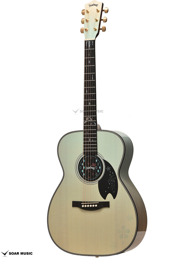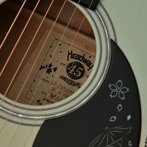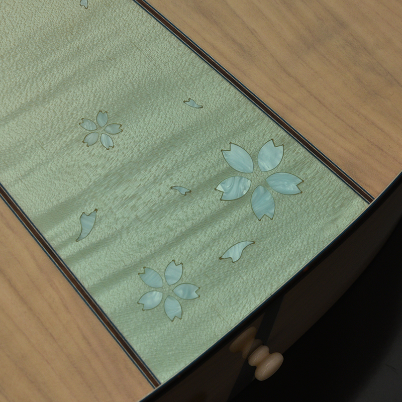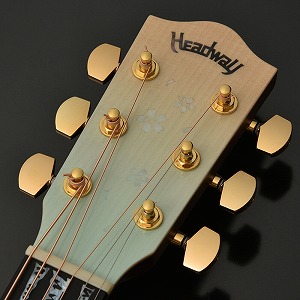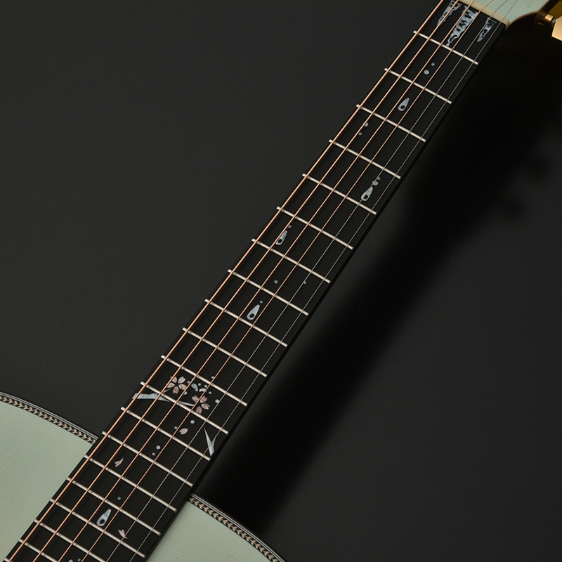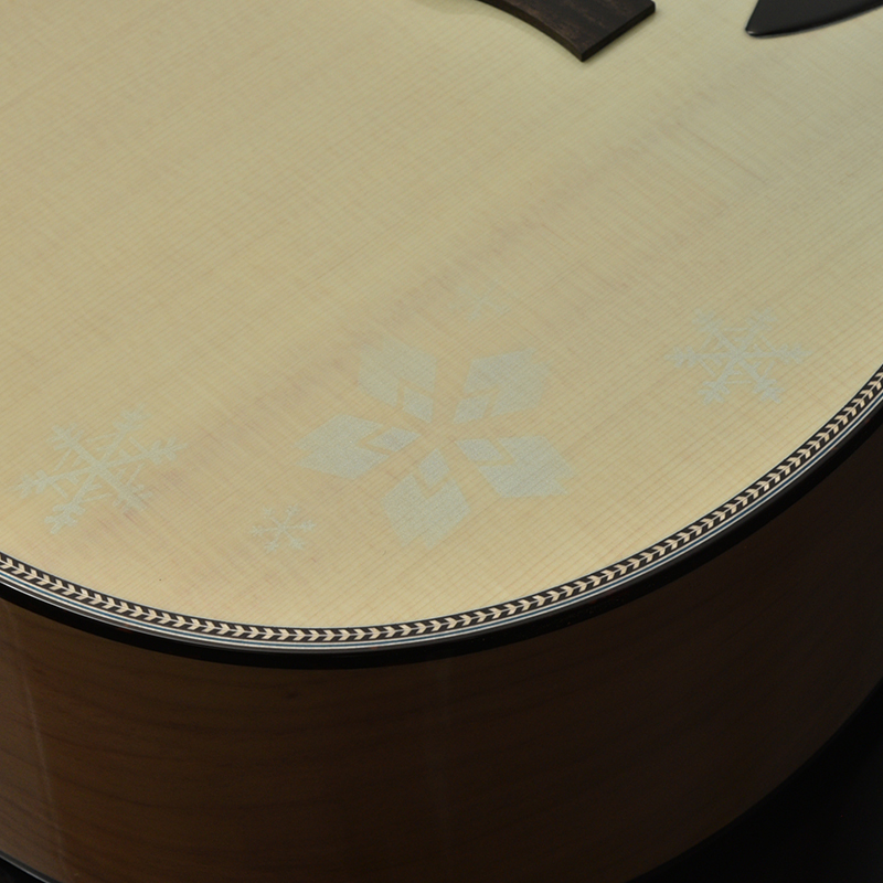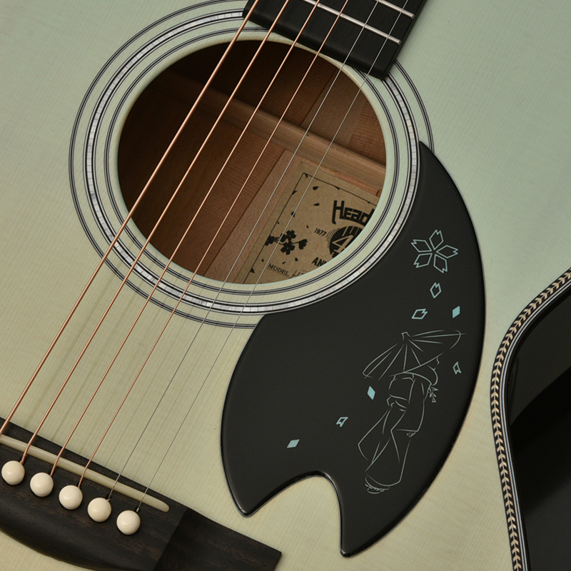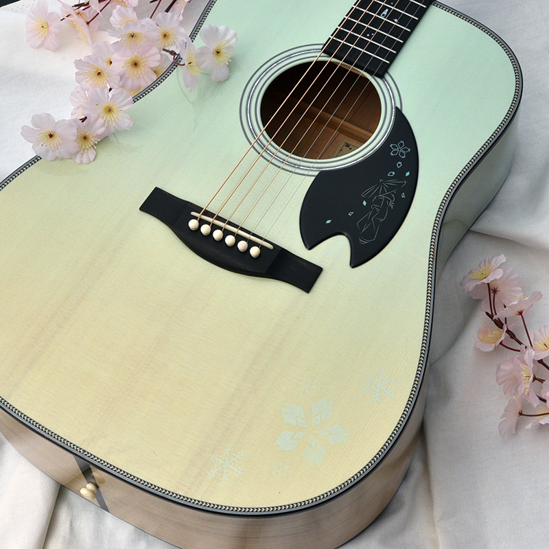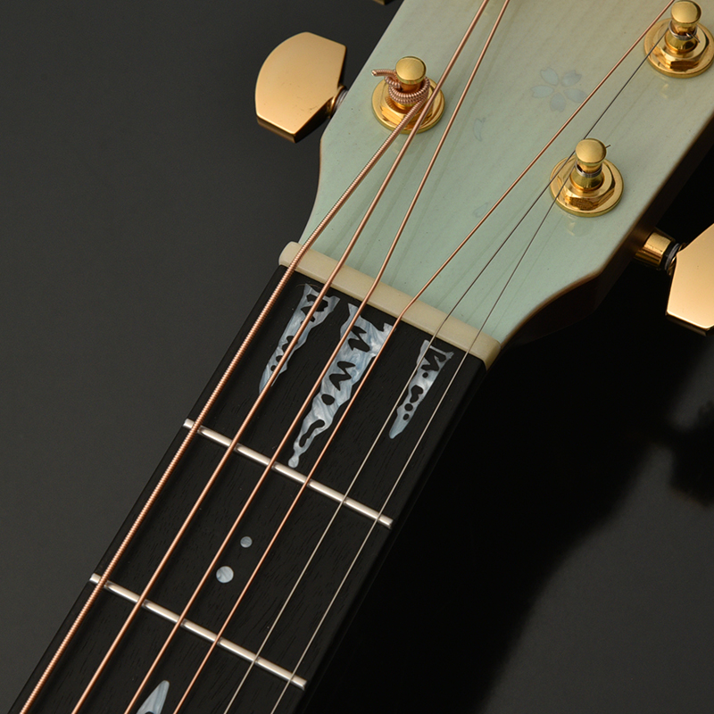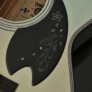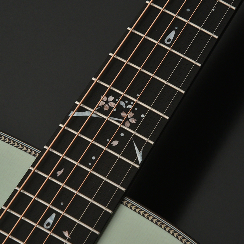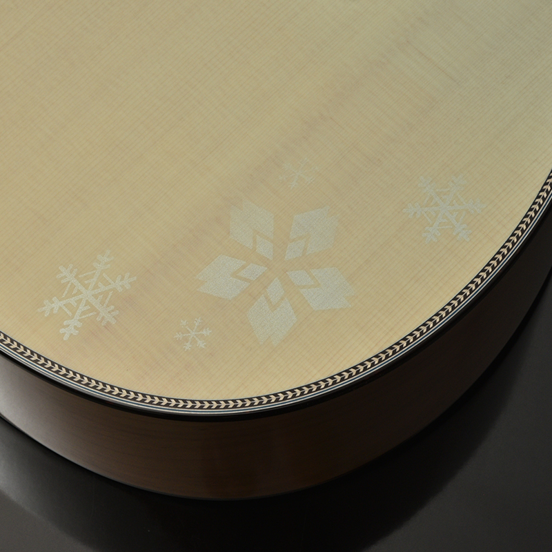 氷のモチーフを表現する為、アコースティックギターでは珍しいマッチングヘッドを採用。さらに、本モデルではインレイの上からグラデーションで着色することにより、凍る桜の華を表現しております。ボディトップには氷の華と雪の結晶をパール塗装で表現しています。