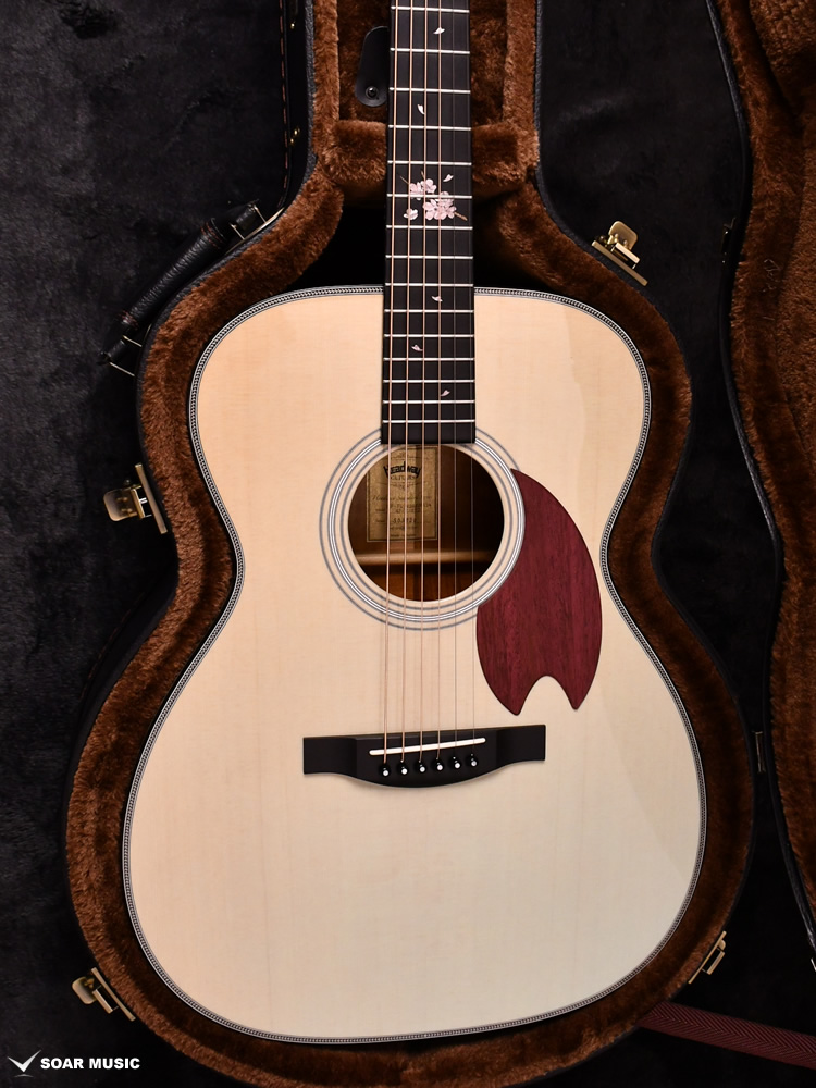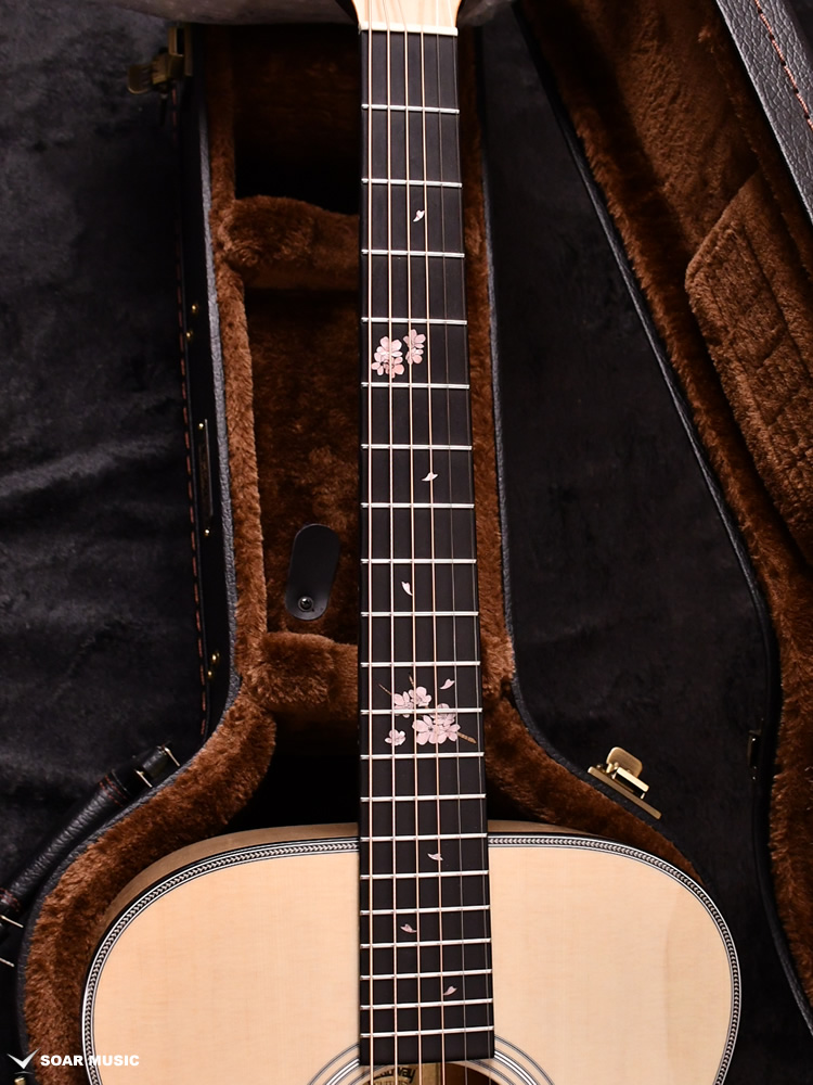 桜モデルを象徴する要素の一つとして、指板上にはアクリルと木材を使用して巧みに表現された桜のインレイが施されています。また、ピックガードには材の色が紫色であることが特徴のパープルハートが用いられました。