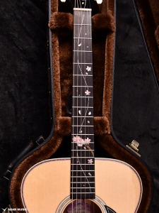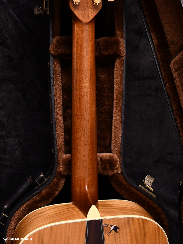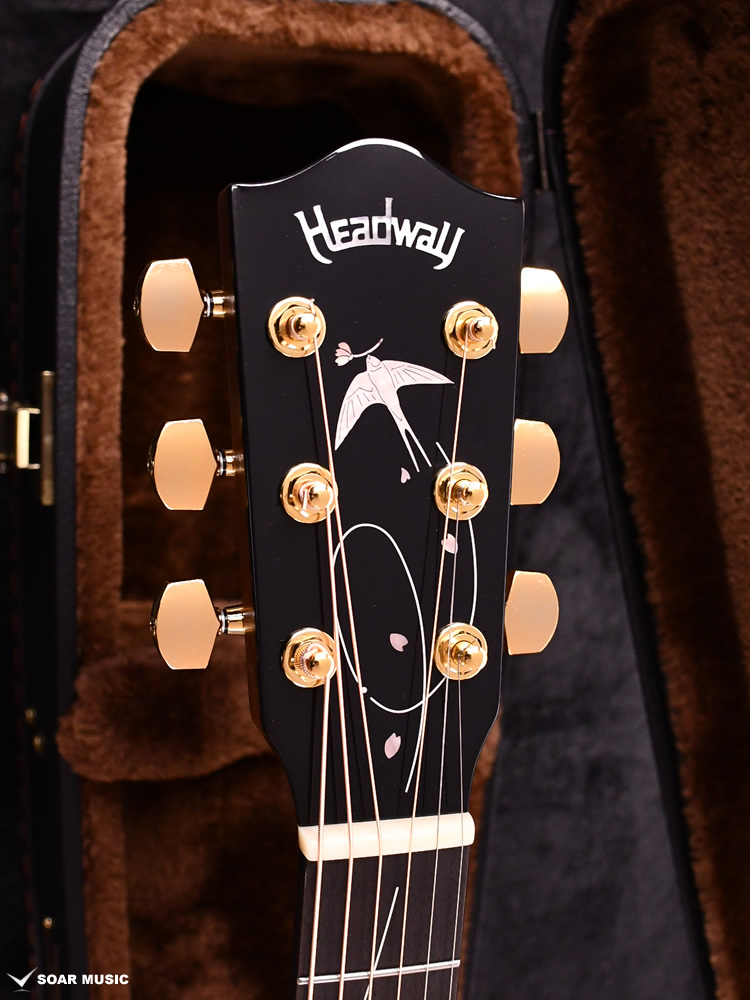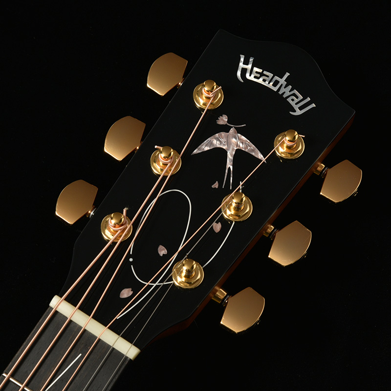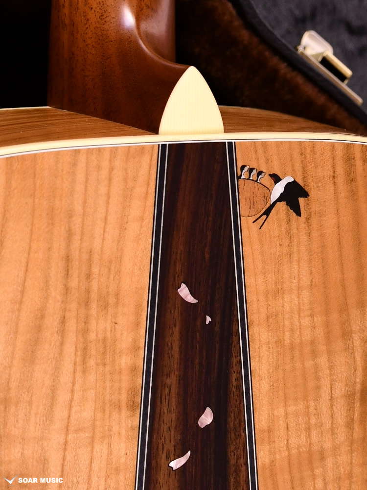 エボニー指板の上を桜を模った色鮮やかなインレイが彩ります。花びらをつなぐように、ツバメの飛び立った軌跡が美しく表現されています。