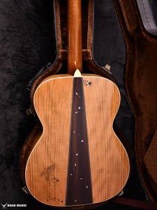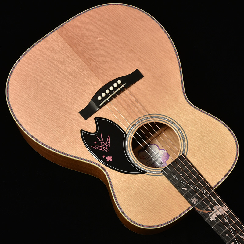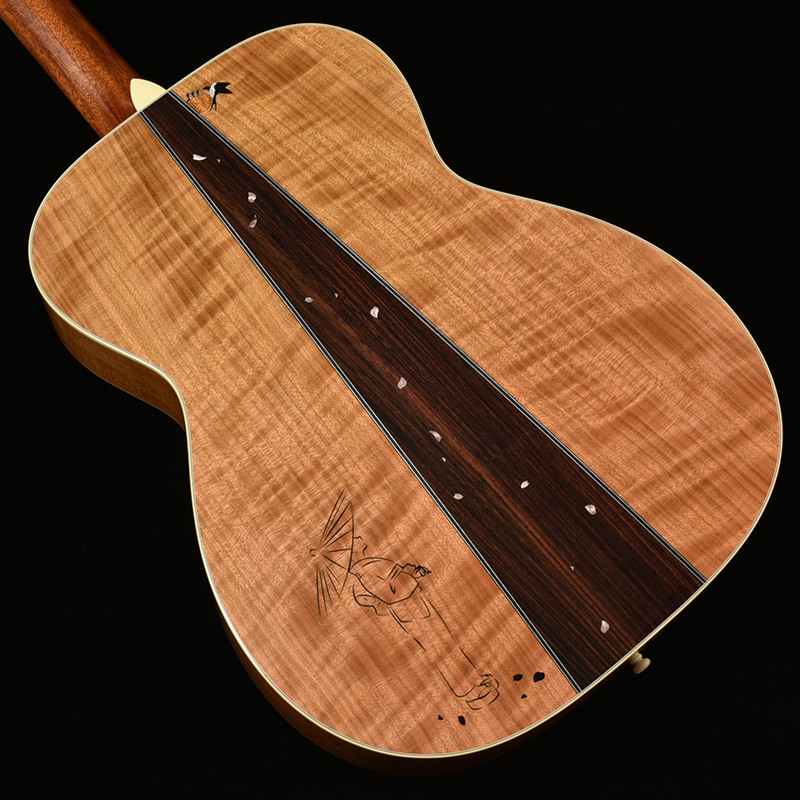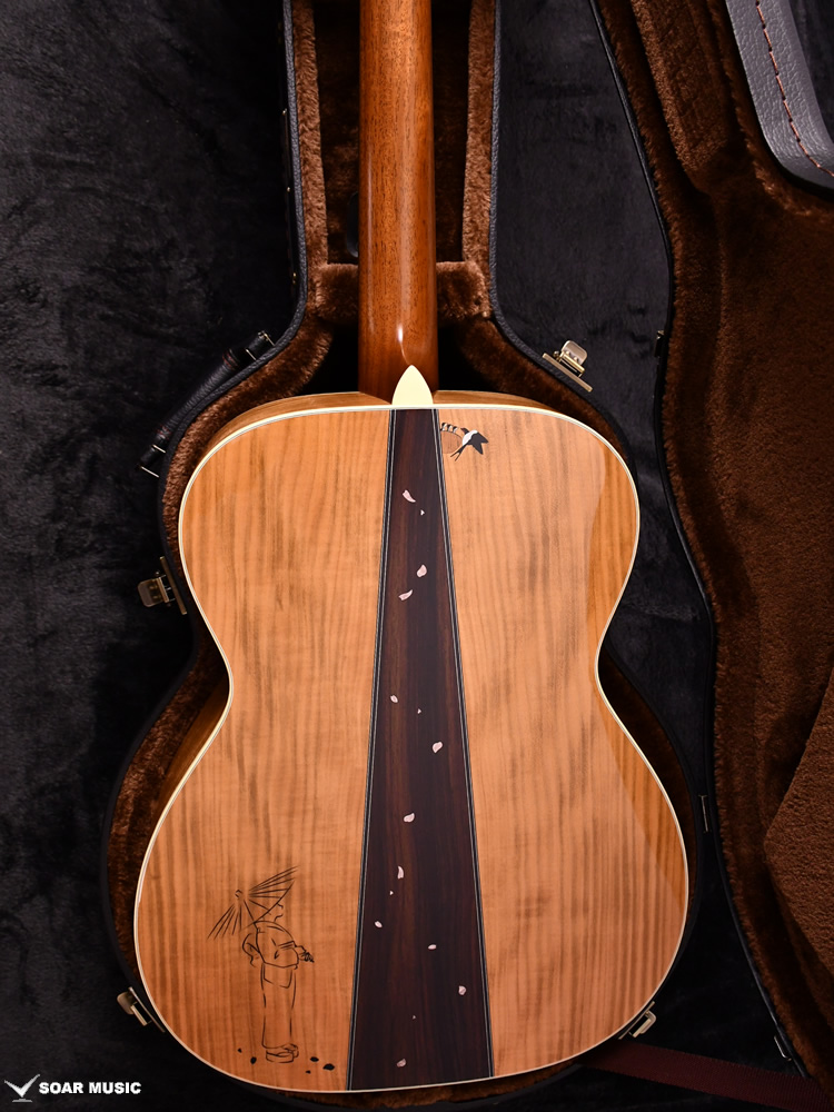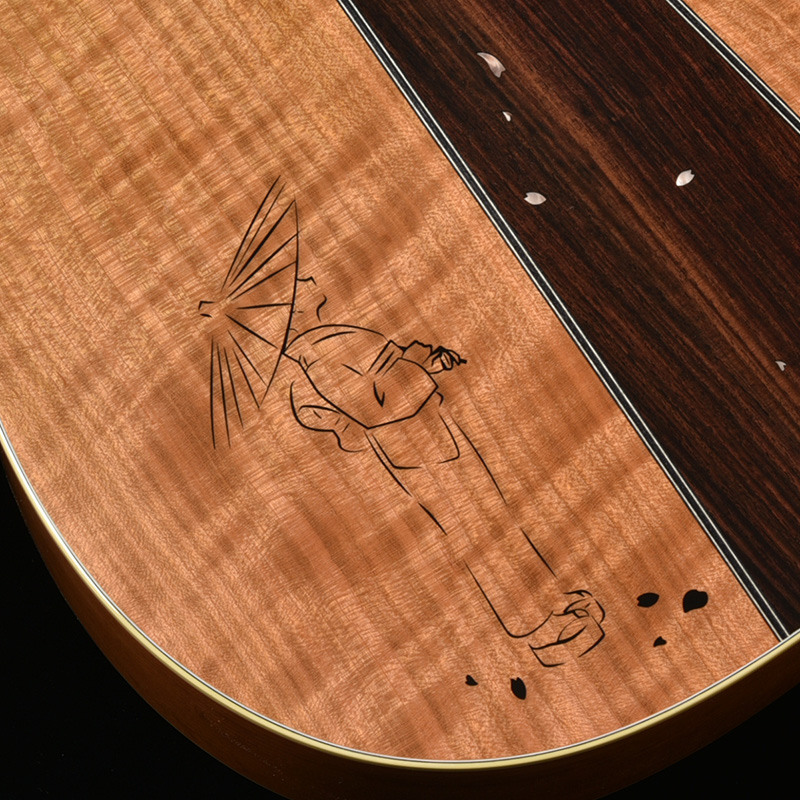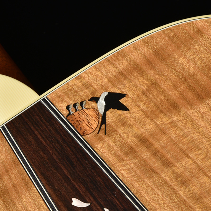 桜ギターの要ともなるサイド&バック材には、甘い音色とフレイム杢を兼ね備えた山桜(ヤマザクラ)が採用されています。バックではインディアンローズウッドをセンターピースに用いることで、いっそう華やかな仕上がりを目指しました。ボディの上部にはツバメの親子がインレイによって表現され、それを見上げる和傘の女性という春の日の一コマを切り取ったかのような美しい情景が描かれます。