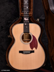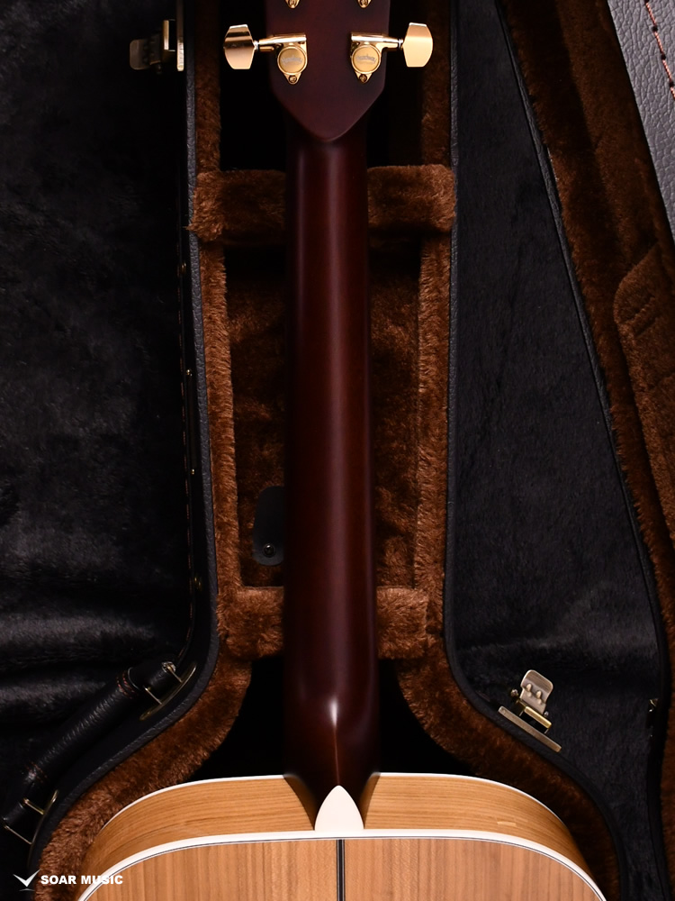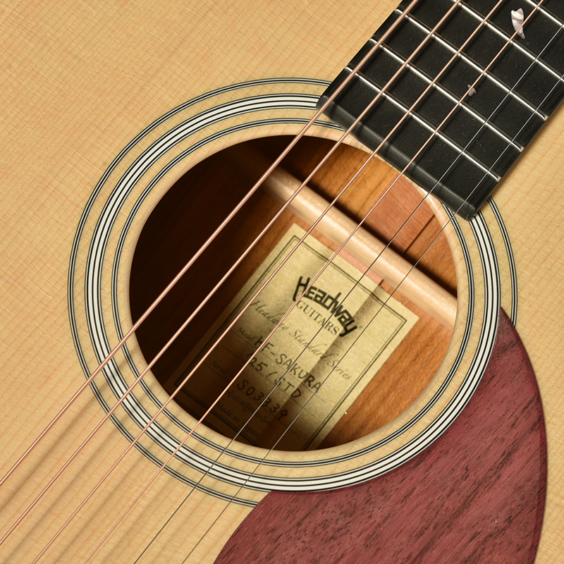 Headwayマスタービルダーの百瀬恭夫が1934年製のビンテージギターのブレーシングを研究し、独自に発展させたブレーシングを継承。Xのクロス位置がサウンドホールに近いセミフォワードシフトで新品時より低音の反応がよく、ボリュームのある鳴りを持ちます。フォワードシフトよりも5mmほどブリッジ寄りなっていることにより、トップ板の安定性も考慮された設計が行われています。