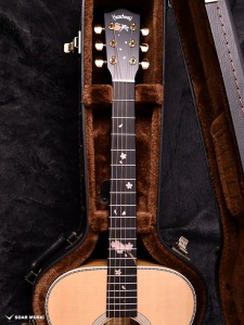桜の花びらを模ったインレイが指板を美しく彩ります。通常のポジションマークをもつギターから持ち替えても違和感の少ないよう、演奏性にも配慮されたデザインです。