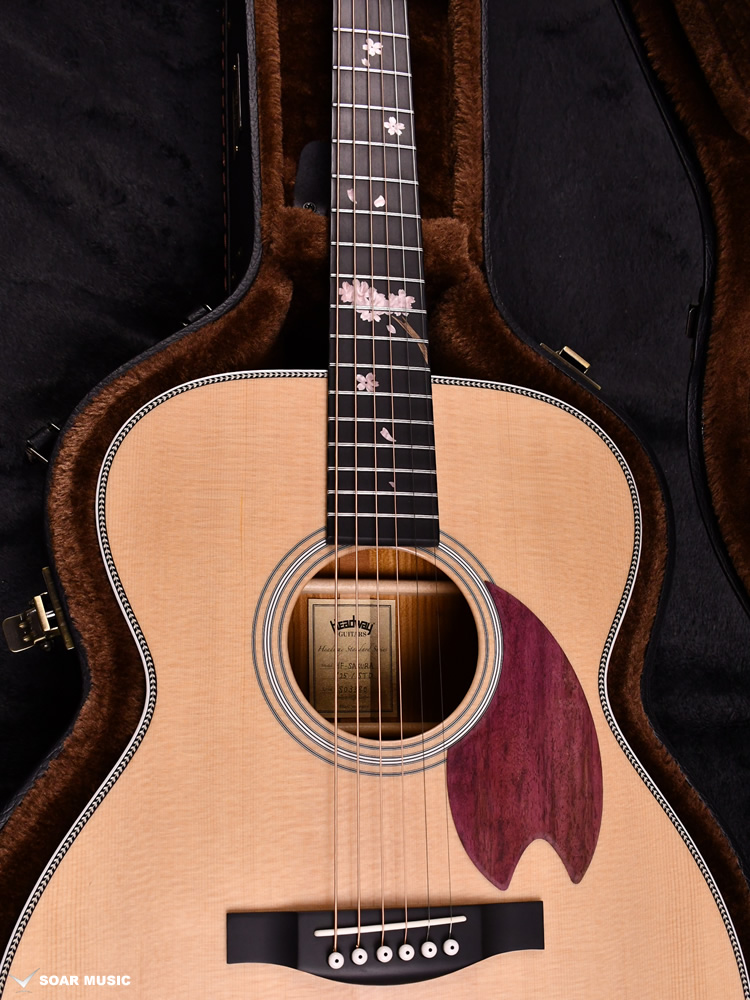 桜ギターを象徴するパープルハート材で作られた桜型のピックガード。最初に作られた一本から変わらない、Headwayの桜ギターである証です。