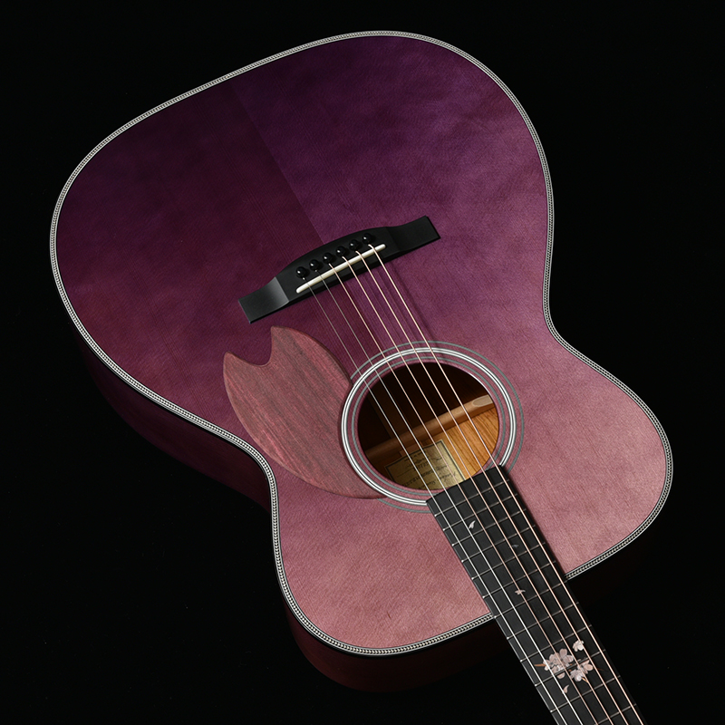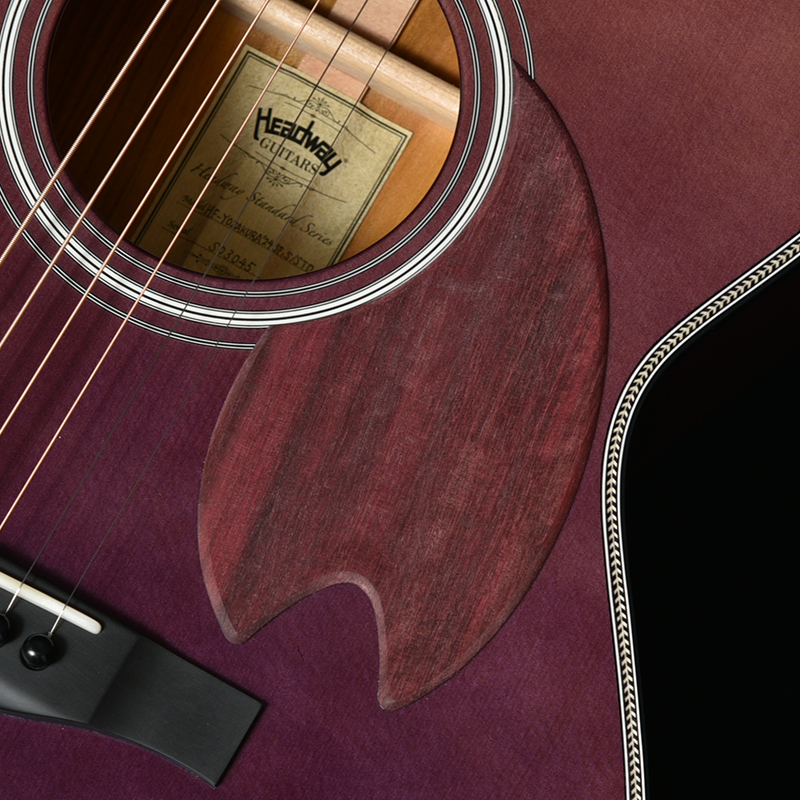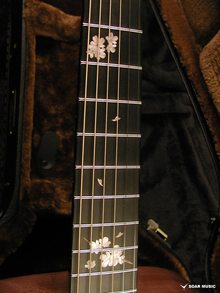 桜モデルを象徴する要素の一つとして、指板上にはアクリルと木材を使用して巧みに表現された桜のインレイが施されています。また、ピックガードには紫色の木色を持つパープルハートが用いられました。