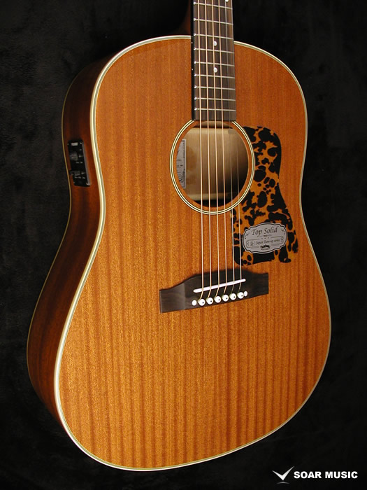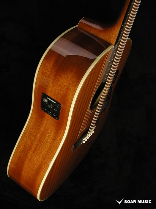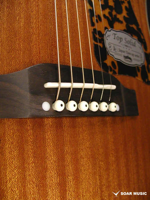 こちらのモデルはボディトップ、サイド&バック材に厳選されたサペリ・マホガニー(合板)を使用しており、豊かな音量と中低音域、暖かみのあるサウンドが特徴です。