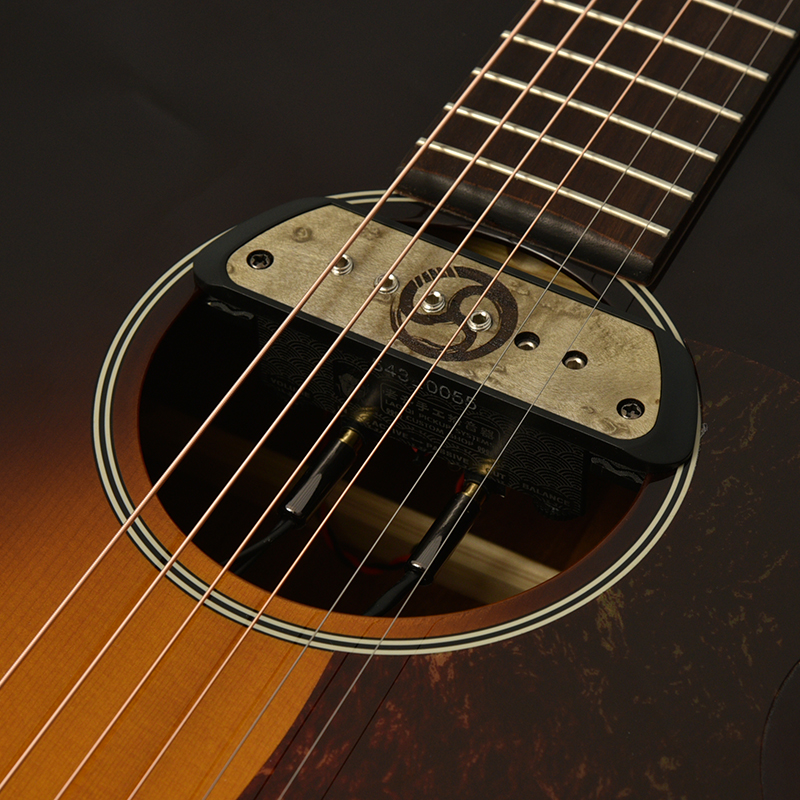 ピックアップメーカーLao Qiがおさむらいさんの要望を取り入れた本格的デュアルピックアップシステム。サウンドホールのマグネットピックアップと二つのコンタクトピエゾマイクによって生音に忠実でボディの打音も余すことなく拾うフィンガースタイルに最適な本格的なサウンドメイキングが可能です。中〜上級者向けのパッシブモードを基本としながら、初心者でも簡単に扱えるアクティブモードへの切り替えもあり様々なシーンで活躍します。