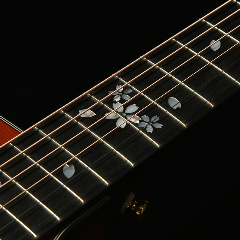 ヘッドトップと指板には桜ギターモデルの多くで採用してきた、桜をモチーフとした装飾を施しています。素材には光の反射角や見る角度によってその輝きが変化する天然の白蝶貝を用いており、桜ギターとしての個性を際立たせます。