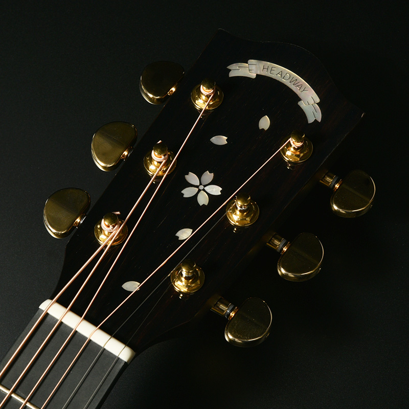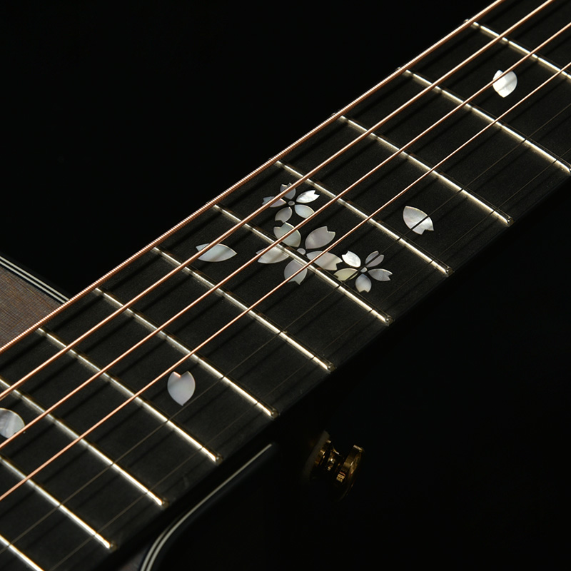 ヘッドトップと指板には桜ギターモデルの多くで採用してきた、桜をモチーフとした装飾を施しています。素材には光の反射角や見る角度によってその輝きが変化する天然の白蝶貝を用いており、桜ギターとしての個性を際立たせます。