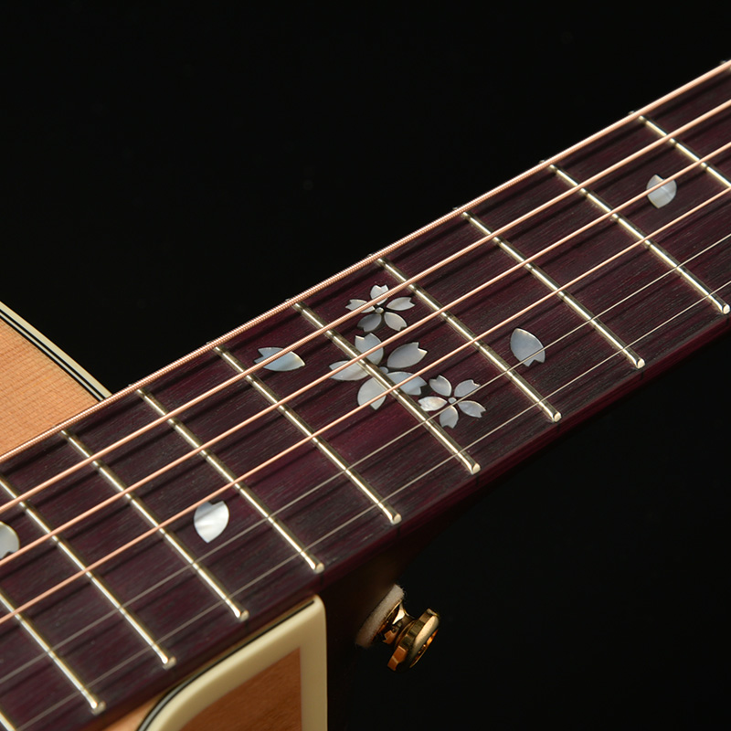 ヘッドトップと指板には桜ギターモデルの多くで採用してきた、桜をモチーフとした装飾を施しています。素材には光の反射角や見る角度によってその輝きが変化する天然の白蝶貝を用いており、桜ギターとしての個性を際立たせます。