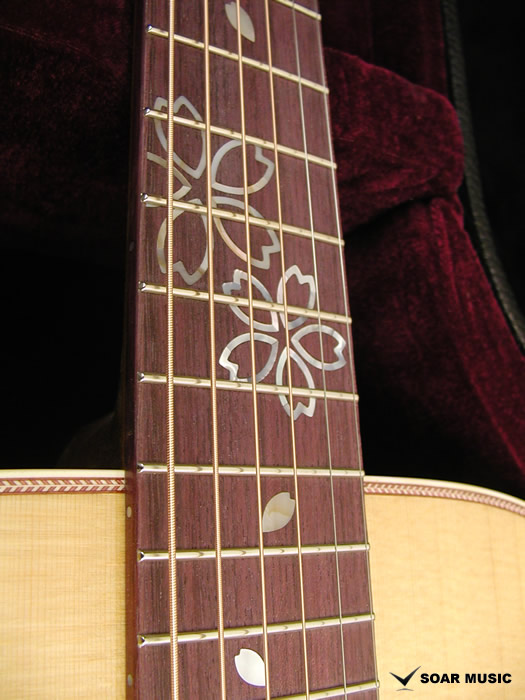 また、ヘッドインレイ・指板インレイ・ピックガードのデザインも一新。桜の花びらをモチーフにしたデザインで、インレイ材は”ピンクパール”を使用しました。