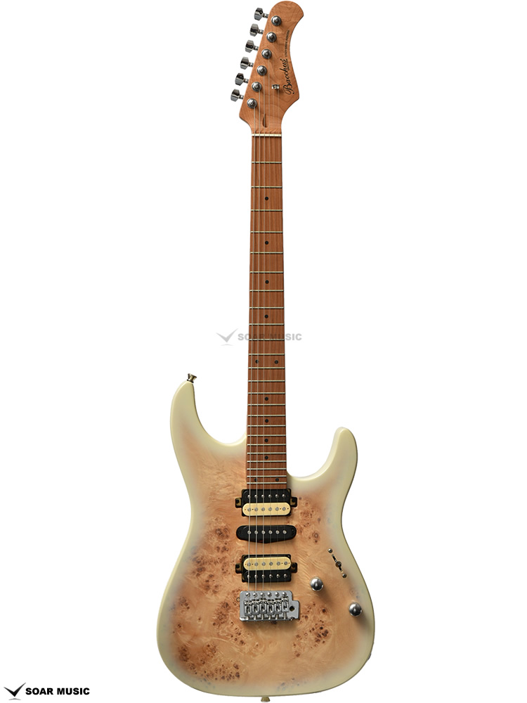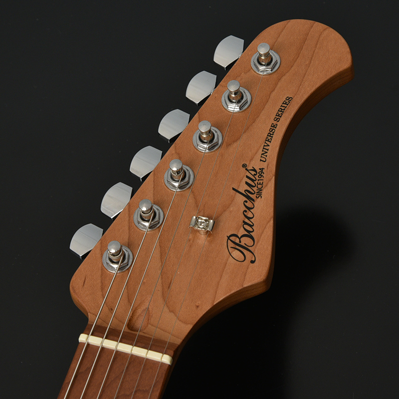ネックにはBacchusの新機軸でもあるローステッドメイプルを採用。 ローストする工程上でゆがみが生じてしまうような木材はその時点で淘汰されるため、ネックとして搭載されている個体は非常にゆがみやねじれに強く、比較的手に取りやすい価格帯ながら長い間ご愛用できる仕様となっております。