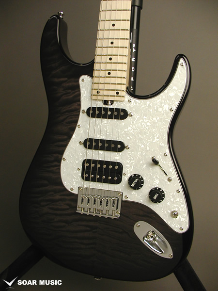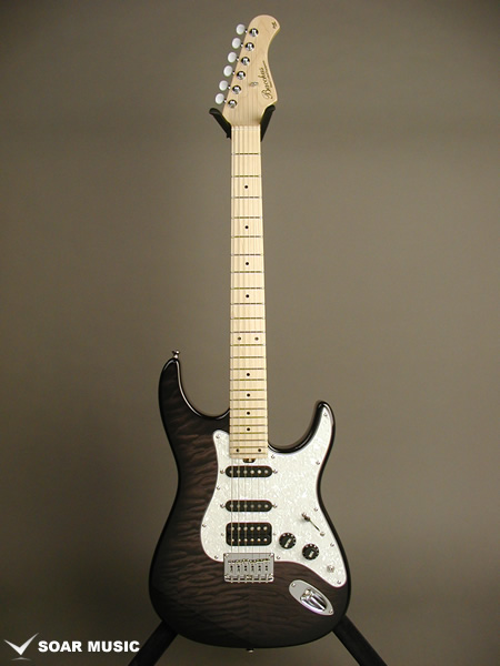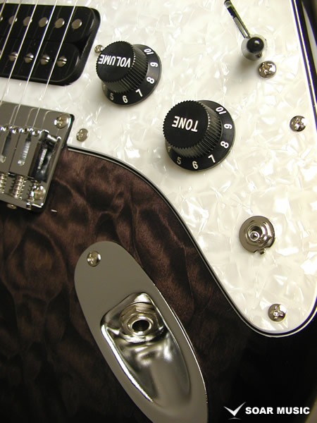レギュラーモデルはアッシュボディとなりますが、カスタム仕様モデルはアルダーバック、キルテッドメイプルトップボディで音の重心をやや低音域側に置きつつも、 アタックレスポンスを加味した抜けの良いサウンドとなっています。また、ブリッジはGOTOH GTC-102を搭載したハードテイル仕様でソリッドボディの鳴りを活かした芯の通ったメリハリのあるサウンドです。