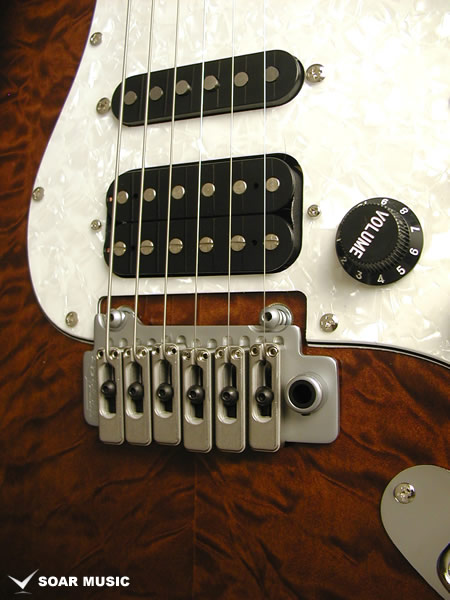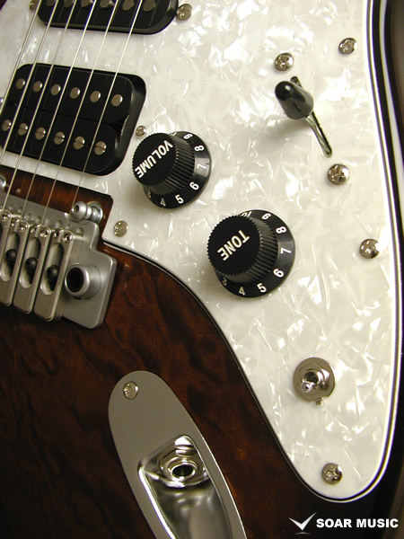 レギュラーモデルはアッシュボディとなりますが、カスタム仕様モデルはアルダーバック、キルテッドメイプルトップボディで音の重心をやや低音域側に置きつつも、 アタックレスポンスを加味した抜けの良いサウンドとなっています。
