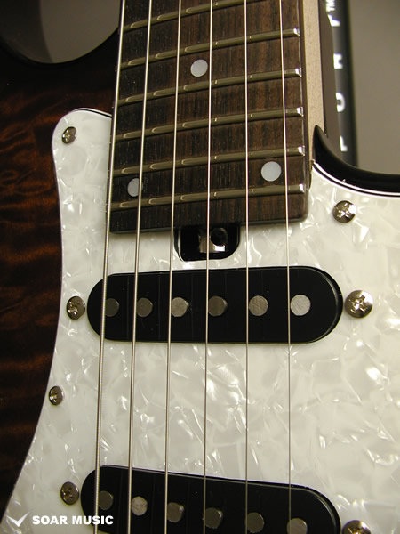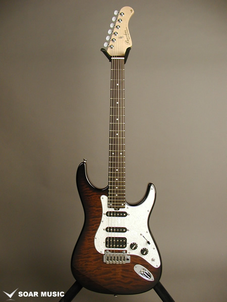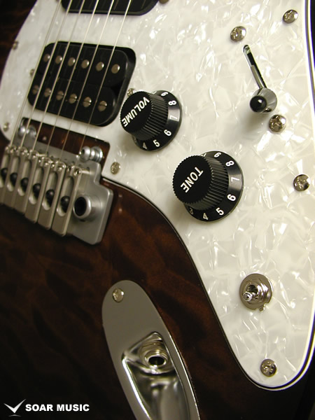 レギュラーモデルはアッシュボディとなりますが、カスタム仕様モデルはアルダーバック、キルテッドメイプルトップボディで音の重心をやや低音域側に置きつつも、 アタックレスポンスを加味した抜けの良いサウンドとなっています。