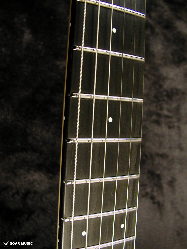 Japanese Red Pine:ボディ部には「アカマツ」を使用しました。このアカマツは、松くい虫により伐採せざるをえなくなってしまった松本市内のアカマツです。ボディの表から側面にかけて貫通する虫食いの穴、枝や根になろうとした形跡である節、局所的に変色したシミ、一般的なギター作りで嫌われる場所を全て含んだこの木材の個性を受け入れ、あえてその特徴を強調してこのギターのオリジナリティとして捉えてもらえるように様々な工夫を凝らしました。これまでの経緯とともに、この個性的過ぎるギターの実物を見て、触れて、音を出してご体感ください。