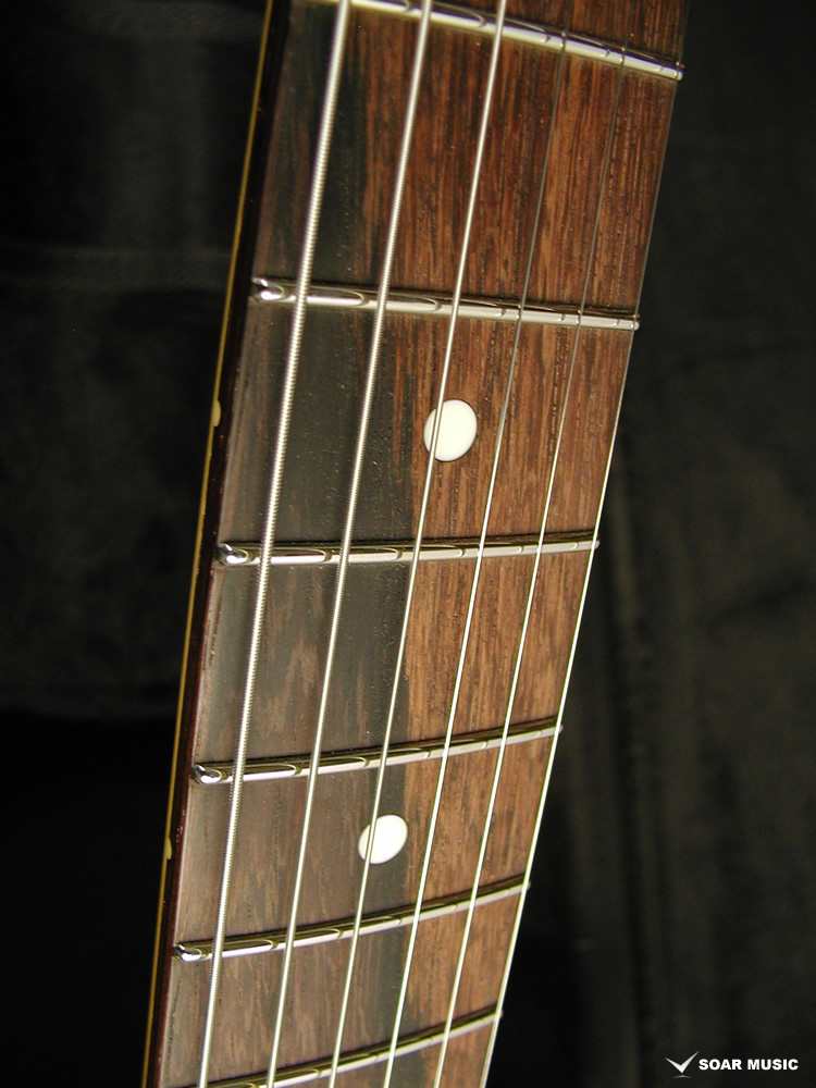 指板サイドには指板と同材を使用したウッドバインディングが施されています。これにより指板サイドが非常に滑らかになり、フレットの「バリ」トラブルも防止します。
