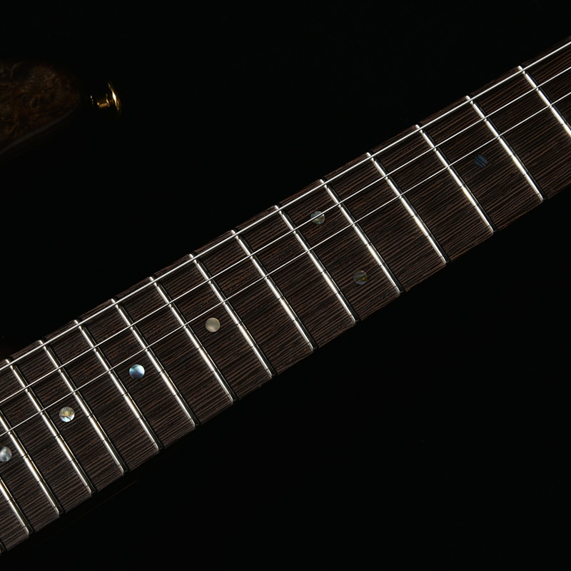 メイプル材などと比べて強度が高く、非常に硬質な特性を持つ「ウェンジ」。指板材に取り入れられることで、安定感のある抜けの良いサウンドを実現します。その美しい見た目から、ヨーロッパでは古くから高級家具材としても使用されてきました。