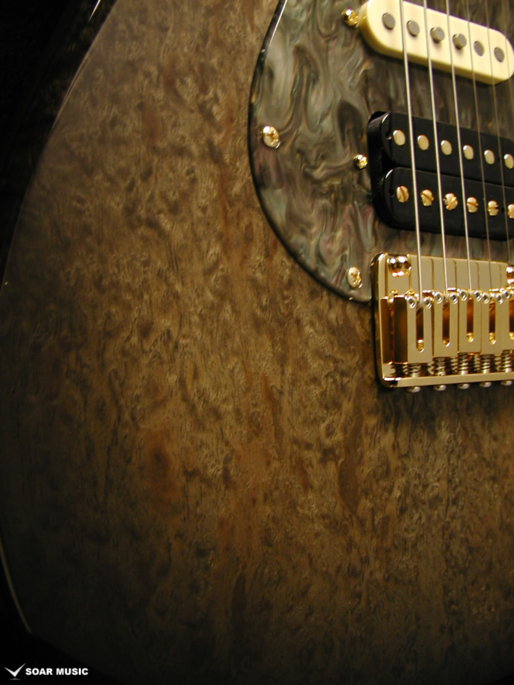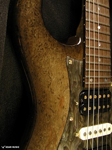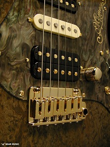 フロント・リアポジションには、Mojotone社のハムバッカータイプをマウント。伝統的なハムバッカーに現代的な味付けを加えるため、低音を少し強調し、サスティーンが長くなるよう調整されています。二つのコイル間でターン数を変えた巻き方がされており、高音域の倍音とレスポンスを高めた、締まりのあるボトムエンドと豊かなサスティーンが持ち味です。