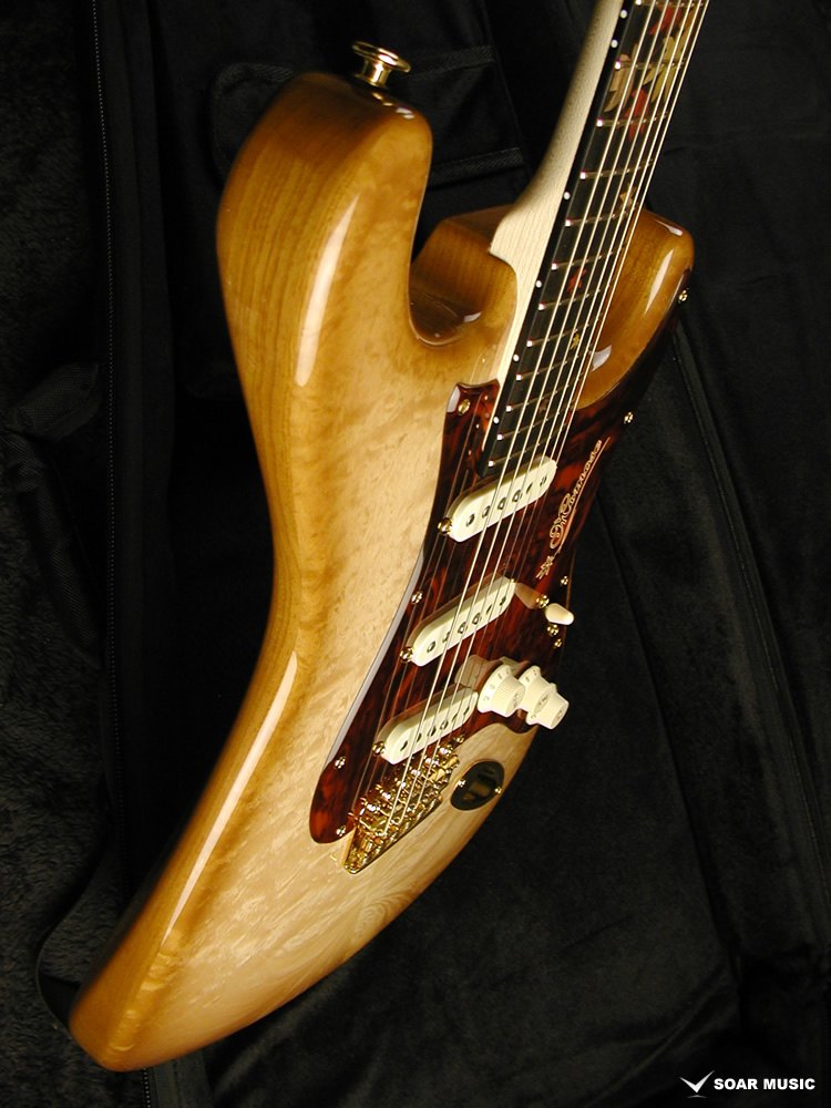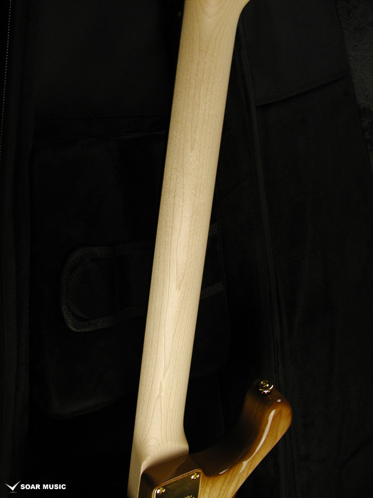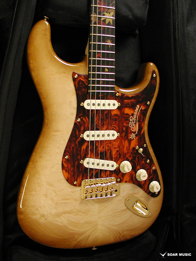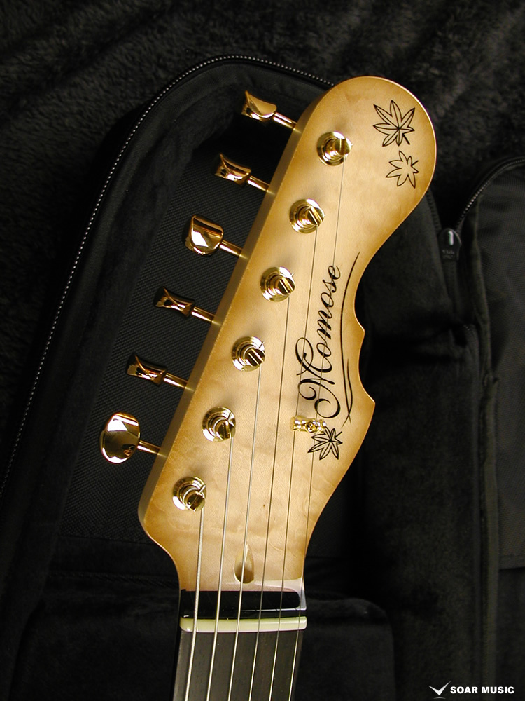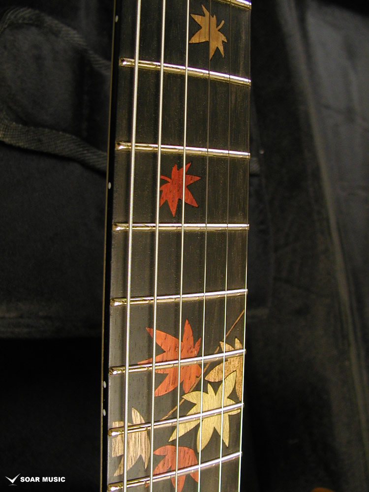 Autumn Leaves:Momose初の秋特別モデル。ボディトップ材に「カエデ」、バック材にアッシュを採用しました。秋の紅葉をモチーフとし、指板にはインレイのもみじの葉が揺れ、ボディカラーはブラウンバーストカラーで仕上げています。デザインはもちろんですが、使用している材からも秋を感じることができる1本です。