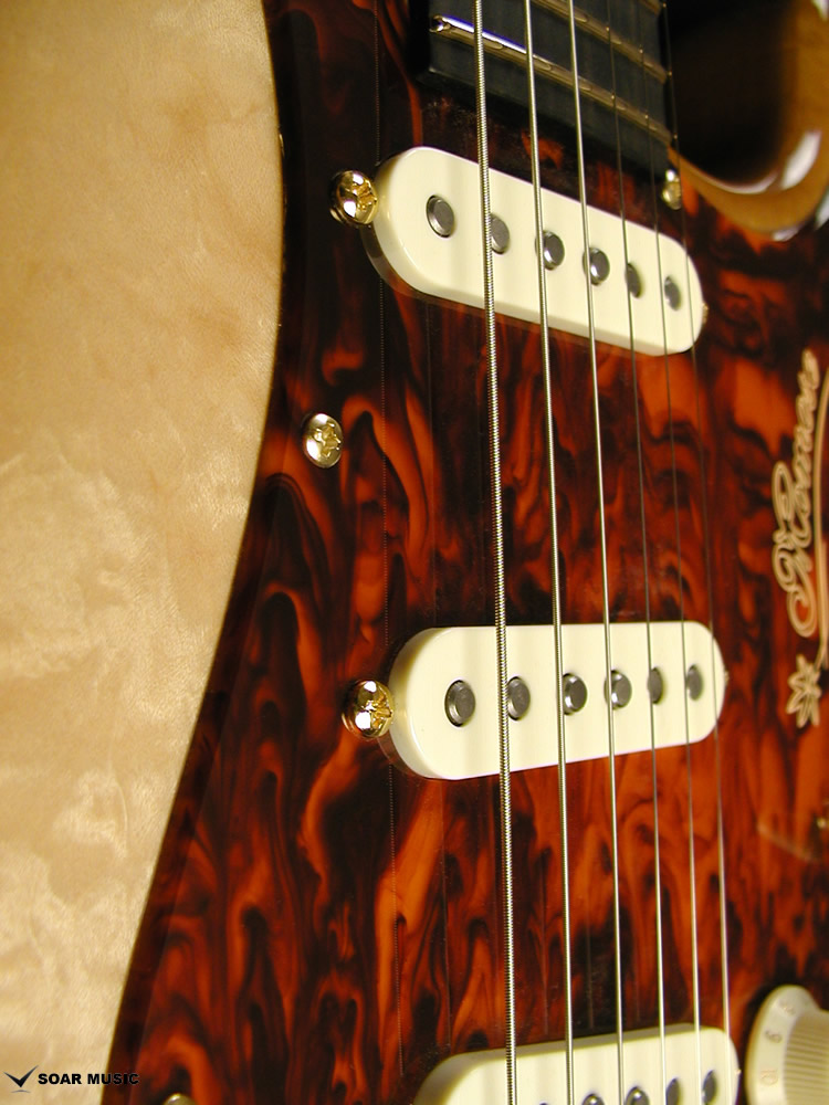 Mojotone Pickup:ピックアップにはMojotoneを採用。ディバイザーが自社製品への組み込みのために独自に仕様変更したモデルを採用しています。ハーフトーン時にハムキャンセルさせるためミドルポジションが逆巻き逆磁極になっています。豊かなミッドレンジとクリアな音質が同居するサウンドを実現し、クリーントーンも良好です。