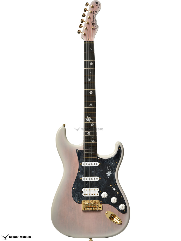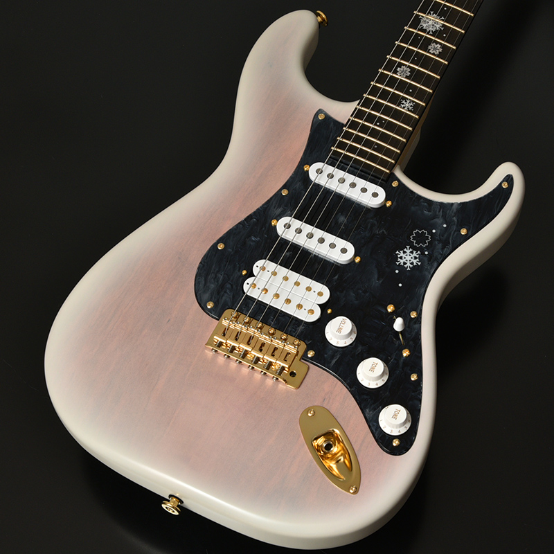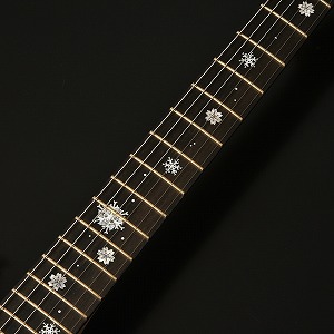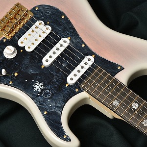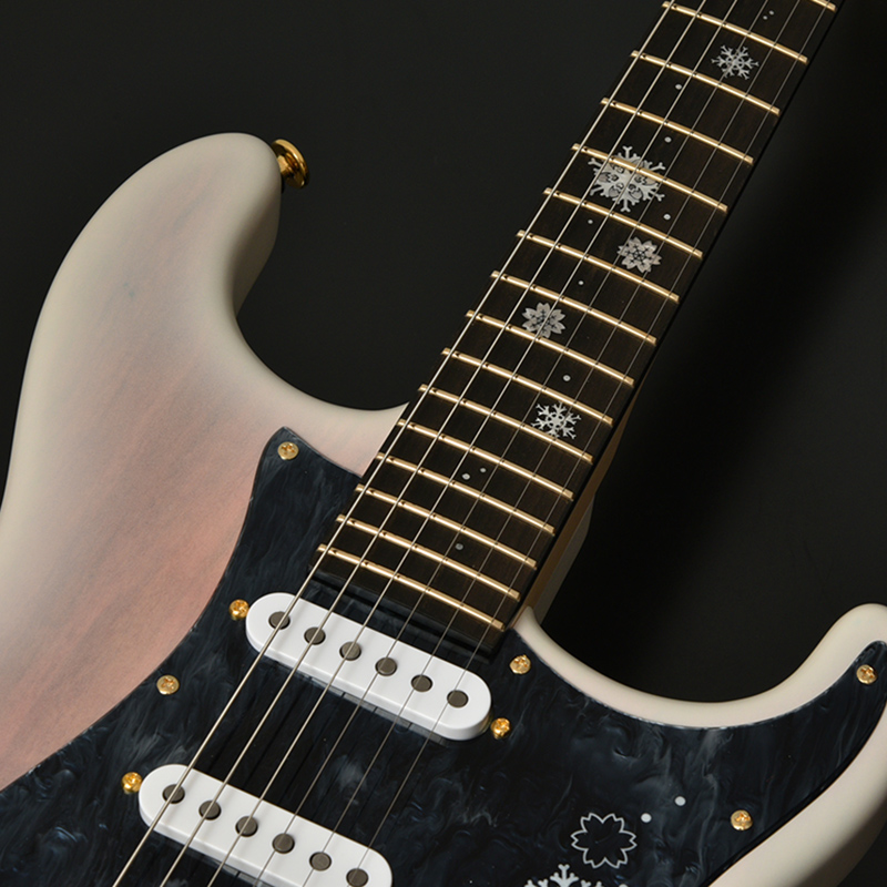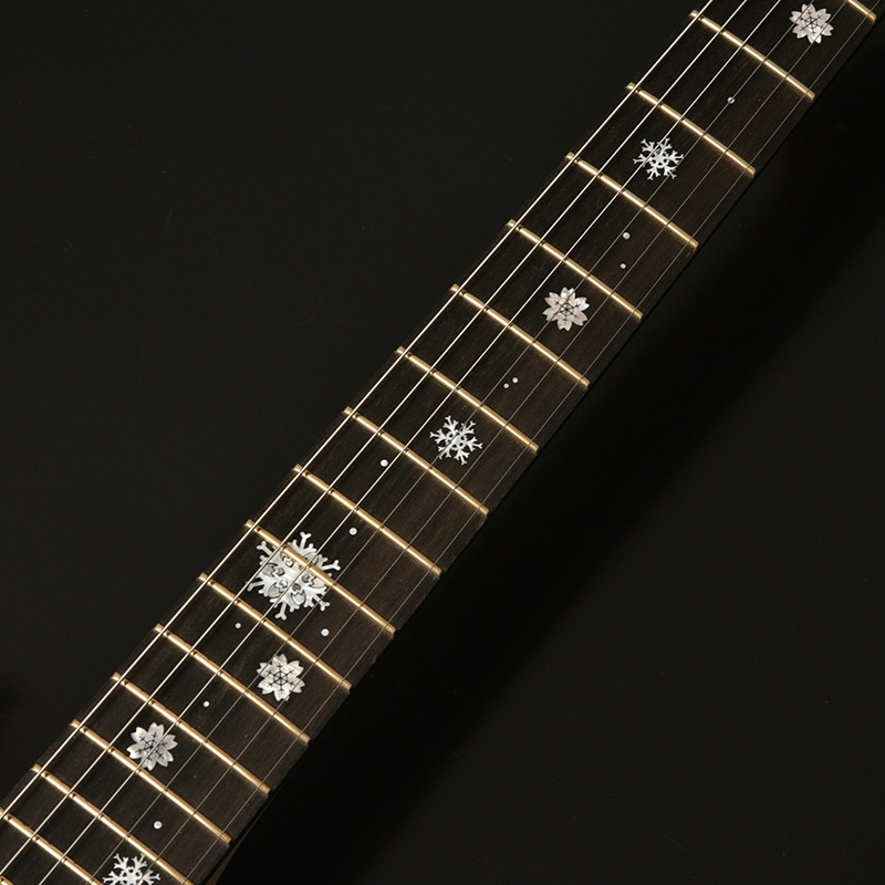 『ONE DAY GUITAR SHOW 2021』の冬桜モデルは「冬の夜」をイメージしたデザインとなっています。 指板にはヘッド側からボディ側へとしんしんと降る雪。 12フレットに大きくデザインされたのは雪の結晶のように凍りついた冬桜。細かなピンクパールのインレイワークが夜空を模した漆黒のエボニー指板に映えます。