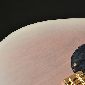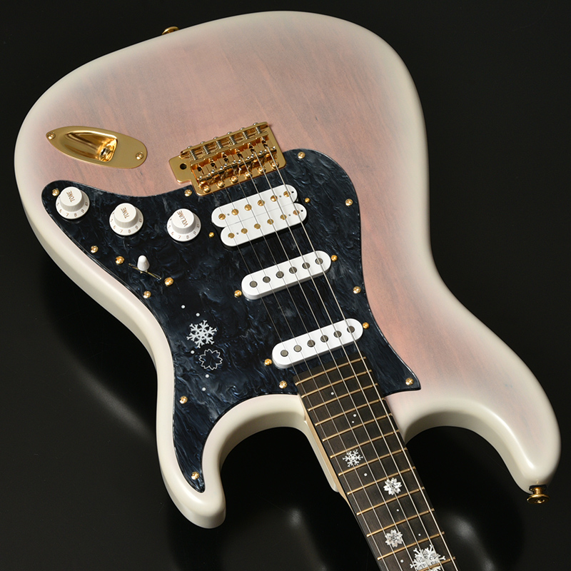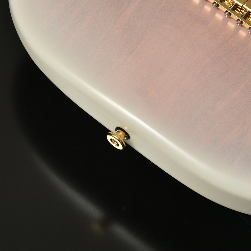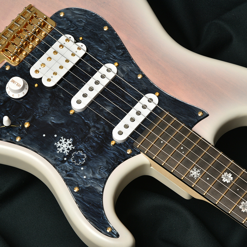 冬桜モデルのカラーリングは冬と桜のコラボレーションをコンセプトに冬桜らしさを表現しました。 最大の特徴は桜色のボディ中央部分とホワイトバーストの組み合わせ。雪の質感を表現するためマット塗装にて仕上げました。 ボディ中央の桜色部分はトップに使用している桜材の杢を際立たせる為、木地着色を行うことで桜材特有の杢目を味わうことの出来る仕上がりになっております。