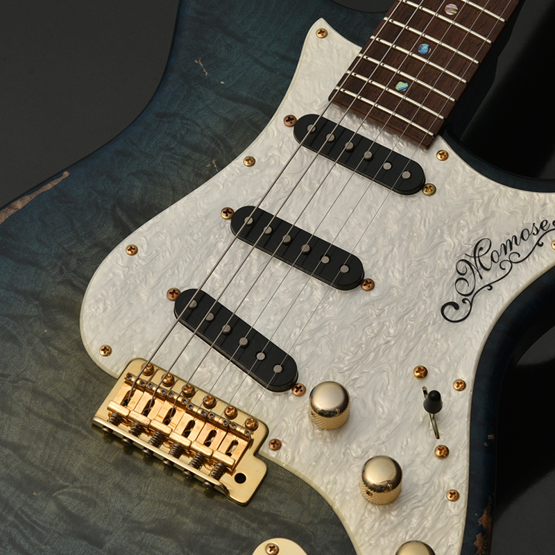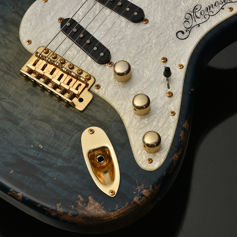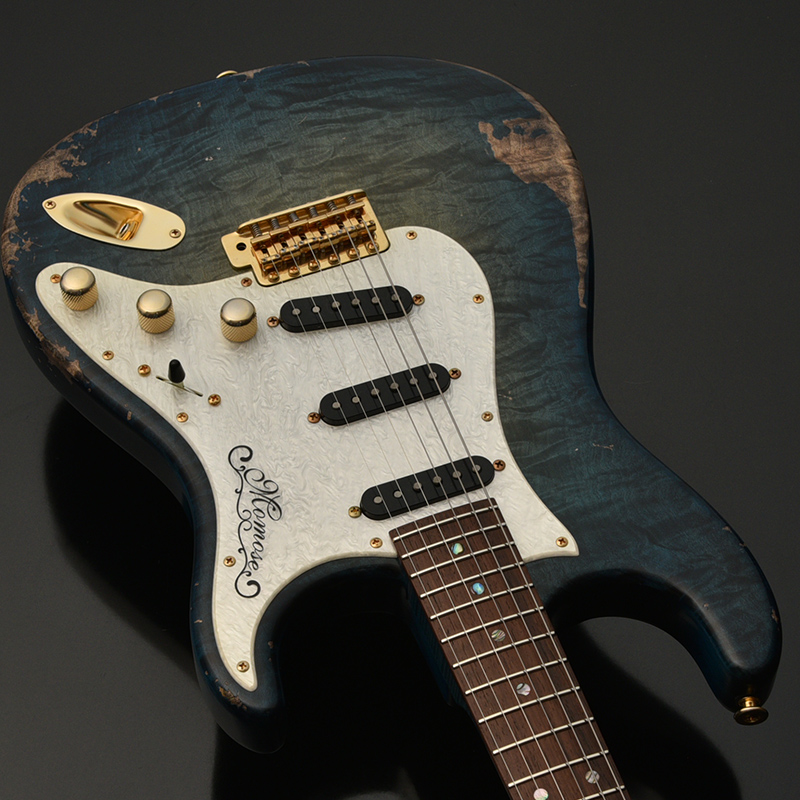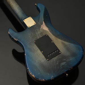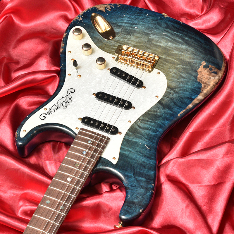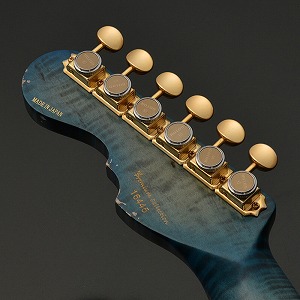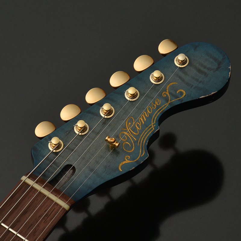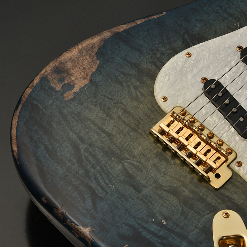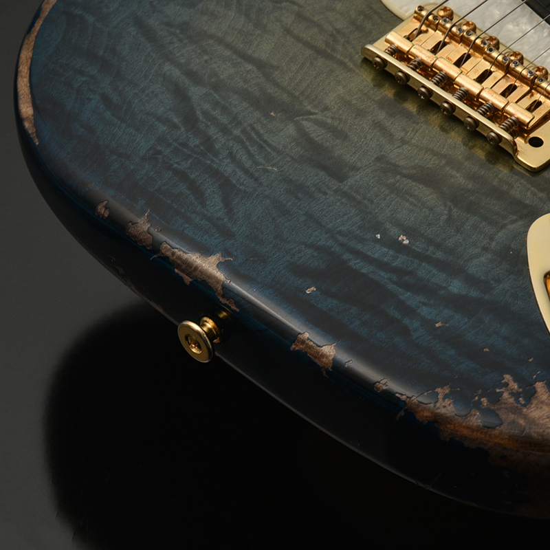 一般的なグロス仕上げではなく、オールラッカーによるこだわりのエイジド加工を施しました。ネックにもボディと同じブルーのバーストカラーが施されています。