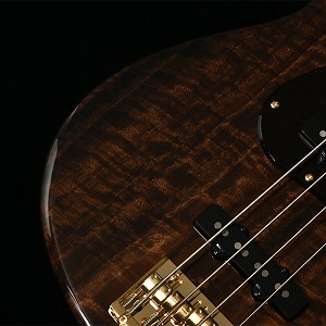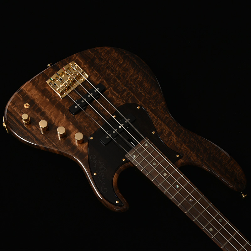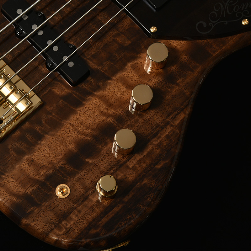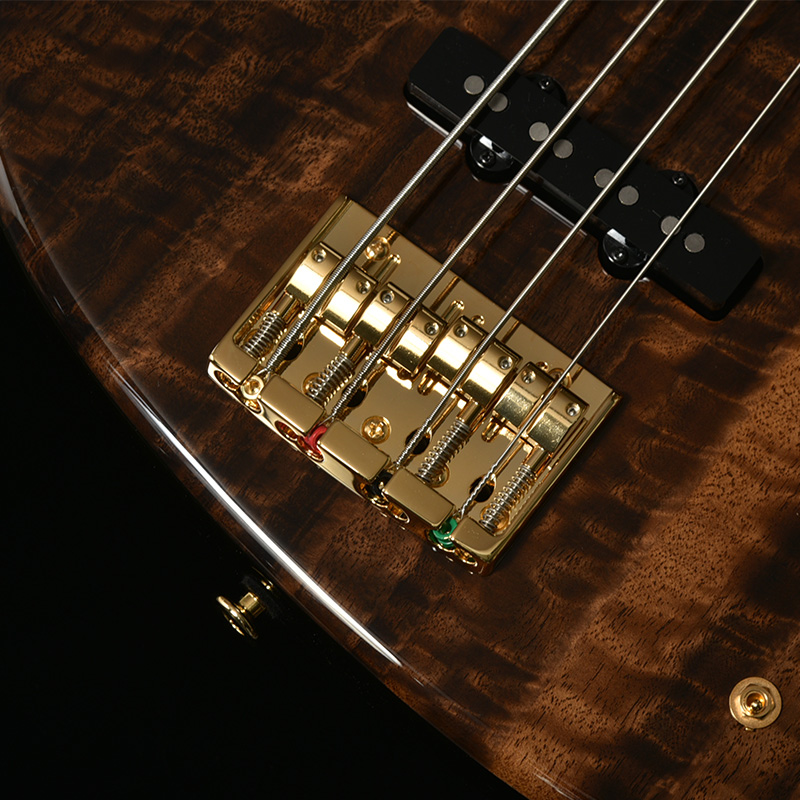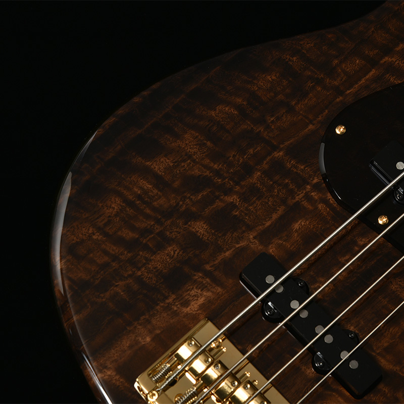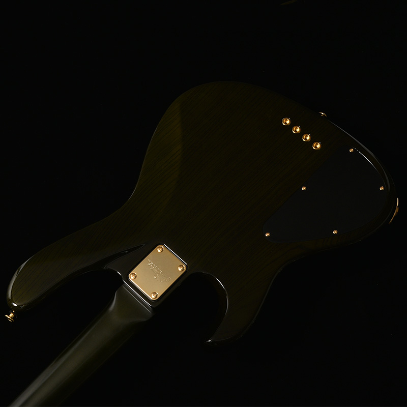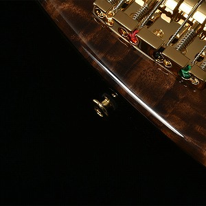 ブラウンのカラーリングを施したユーカリ材をボディトップに使用。一概に「ユーカリ」といってもその種類はとても多く、種や個体によって杢目に違いが出ます。ボディバックには年々希少性を増すアッシュ材を1ピースで使用した、贅沢な仕様の1本です。